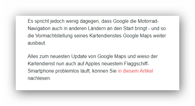 Wenn der Test der "Motorradfunktion" in Indien läuft und der Schwerpunkt auf "Abkürzungen und Schleichwege die mit dem Zweirad leicht zuerreichen sind" liegt mag es für Kurierdienste und andre die es "eilig" haben nützlich sein, eine kurvenreiche Strecke mit wenig Autoverkehr dürfte da wohl nicht bei rauskommen. Eher die Nutzung von "Feldwegen zwischen den Slums".