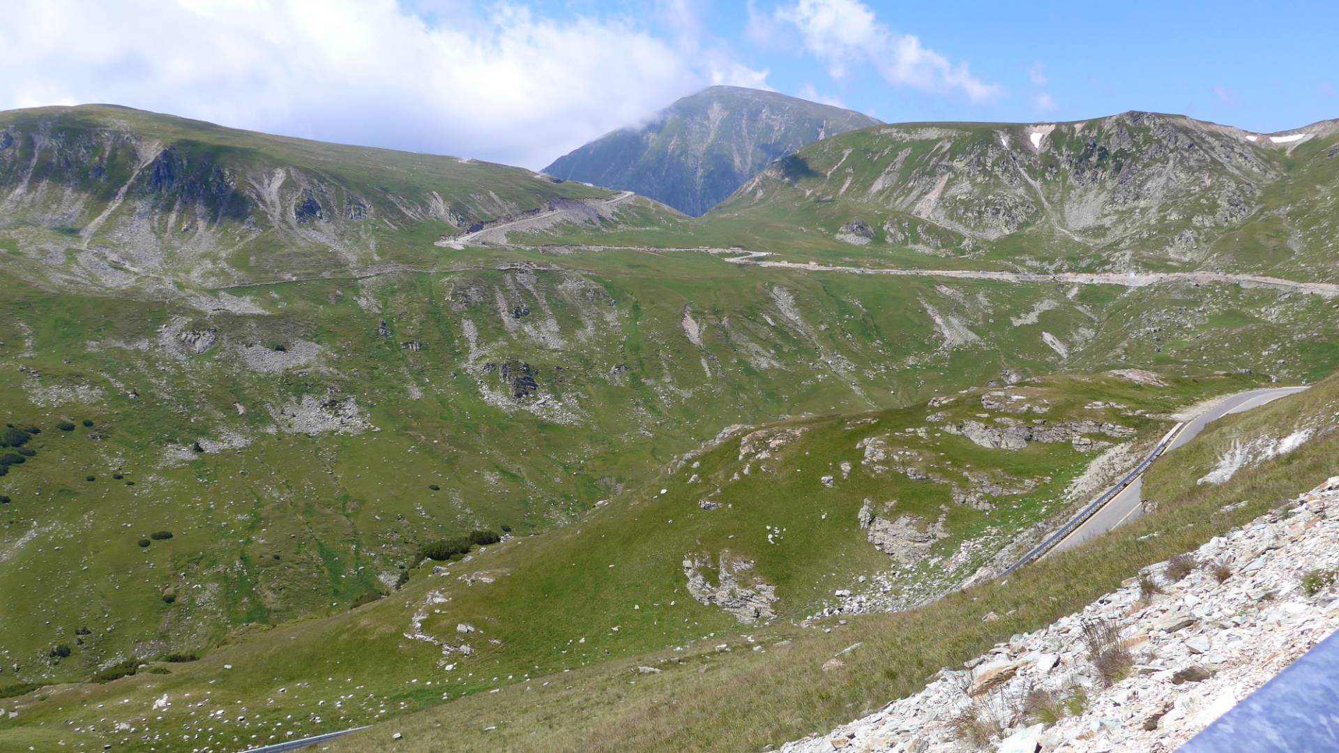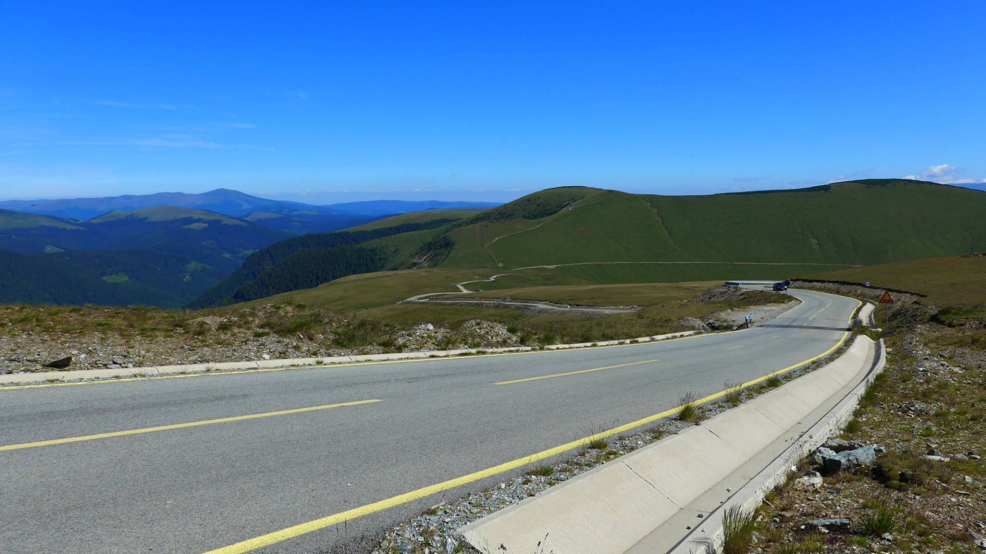Wir folgten der Transaplina weitere 24km nach Süden. Die Strecke war einfach nur ein Traum. Fast kein Verkehr, Kurven in allen Radien und die Straße war zum Teil immer noch neu geteert. Die Landschaft war ebenfalls traumhaft. Man fuhr fast immer ganz oben auf den Bergen mit einer überwältigenden Aussicht. Das hatte die Transfagarasan nicht zu bieten.