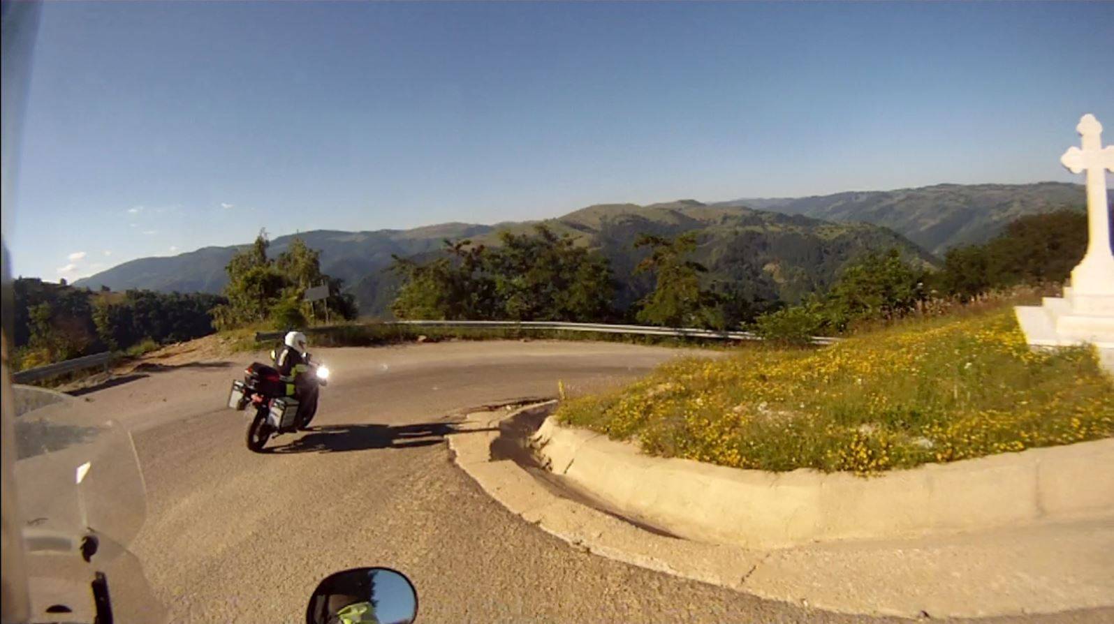 Jetzt kam das was Motorradfahrer lieben. 15km Kurven auf nagelneuem Asphalt versüßten uns den Tag. Serpentine um Serpentine schraubten wir uns hoch. Uns kam ein sehr langsam fahrender GS-Fahrer entgegen. Er war so langsam, weil er in der rechten Hand eine Videokamera hochhielt und die Abfahrt vom Pass filmte. Die vier Autofahrer, die sich an die 30er Begrenzung hielten, waren schnell überholt. Oben angekommen fuhren wir auf eine Wiese zu anderen Motorradfahrern und machten erst einmal Pause. Die Aussicht von hier oben, eine 360 Grad Rundumsicht, war atemberaubend.