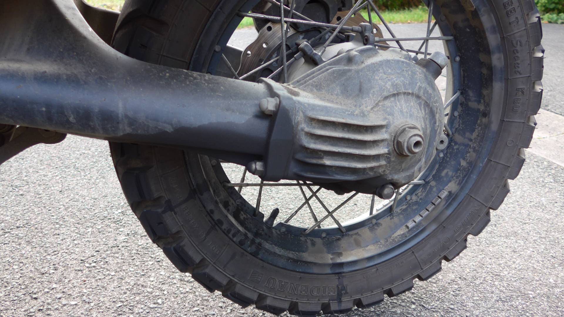 Ich habe mir das Hinterrad heute noch einmal genauer angesehen. Das Öl kommt vermutlich von einem undichten Simmerring (Radialwellendichtring) zwischen Kardan und Rad. Dort hat sich das Öl deutlich verteilt.