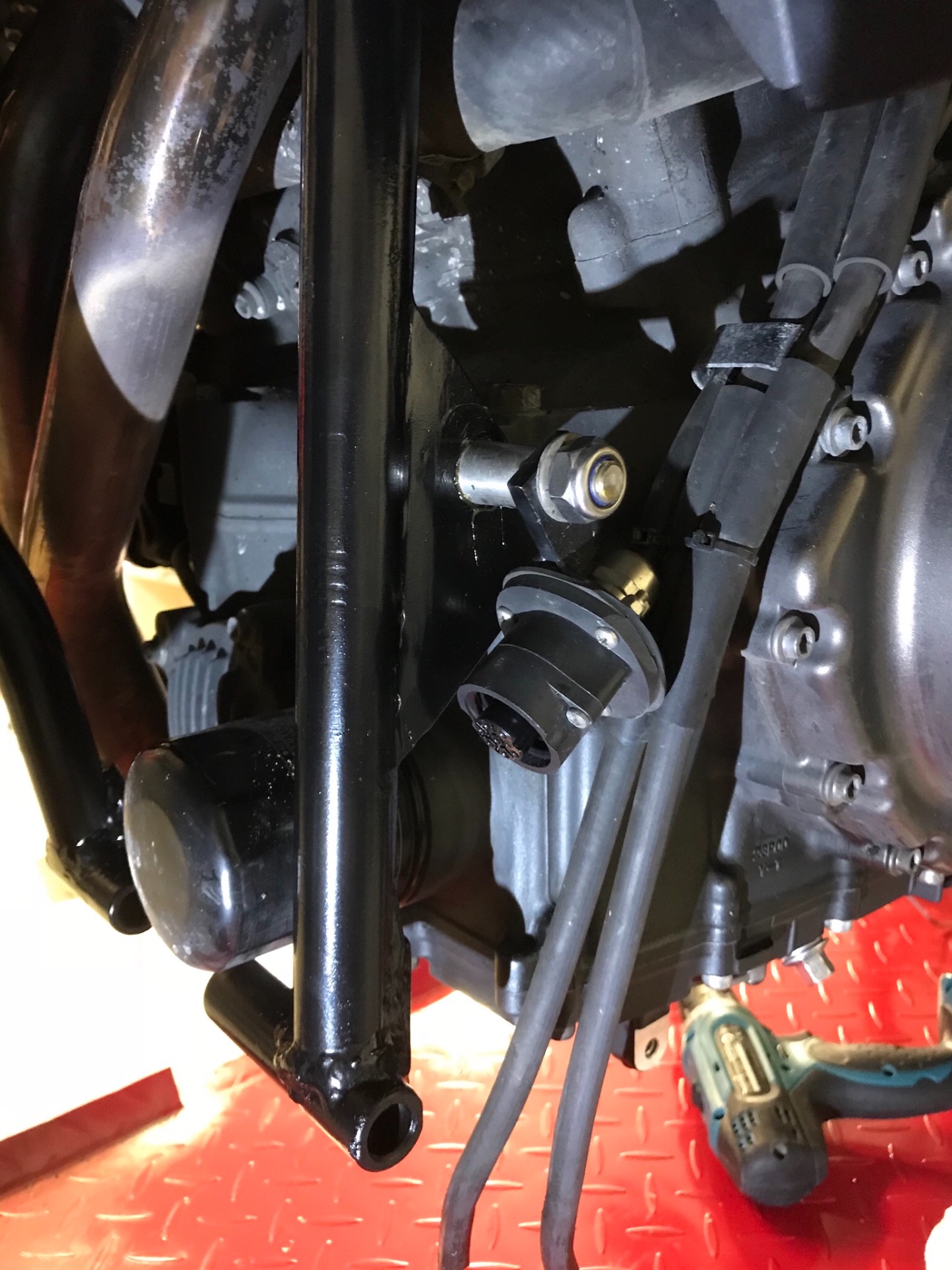 Der Motorschutz nicht der Sturzbügel..., der der beim Original Yamaha-Teil an zwei Blechformteile mit je M5 und mit einer M6 Schraube ann der Ölwanne (!) befestigt wird