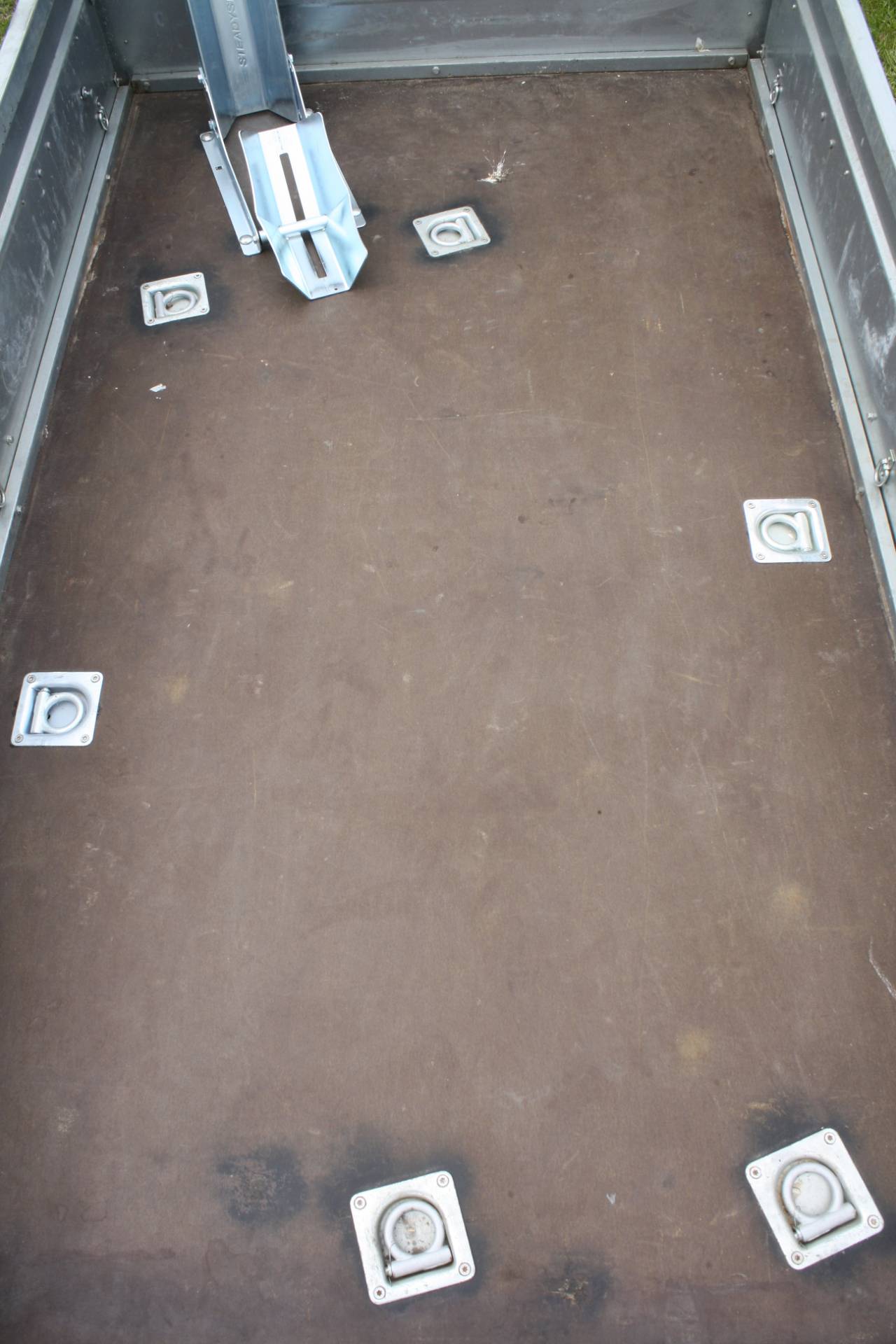 Für den Fall, dass ich mal ein Zweirad transportieren muss, habe ich zusätzliche Verzurrösen eingelassen und kann eine Wippe montieren. Aufgrund der Innenabmaße des Anhängers habe ich die Anordnung diagonal gewählt (funktioniert problemlos).