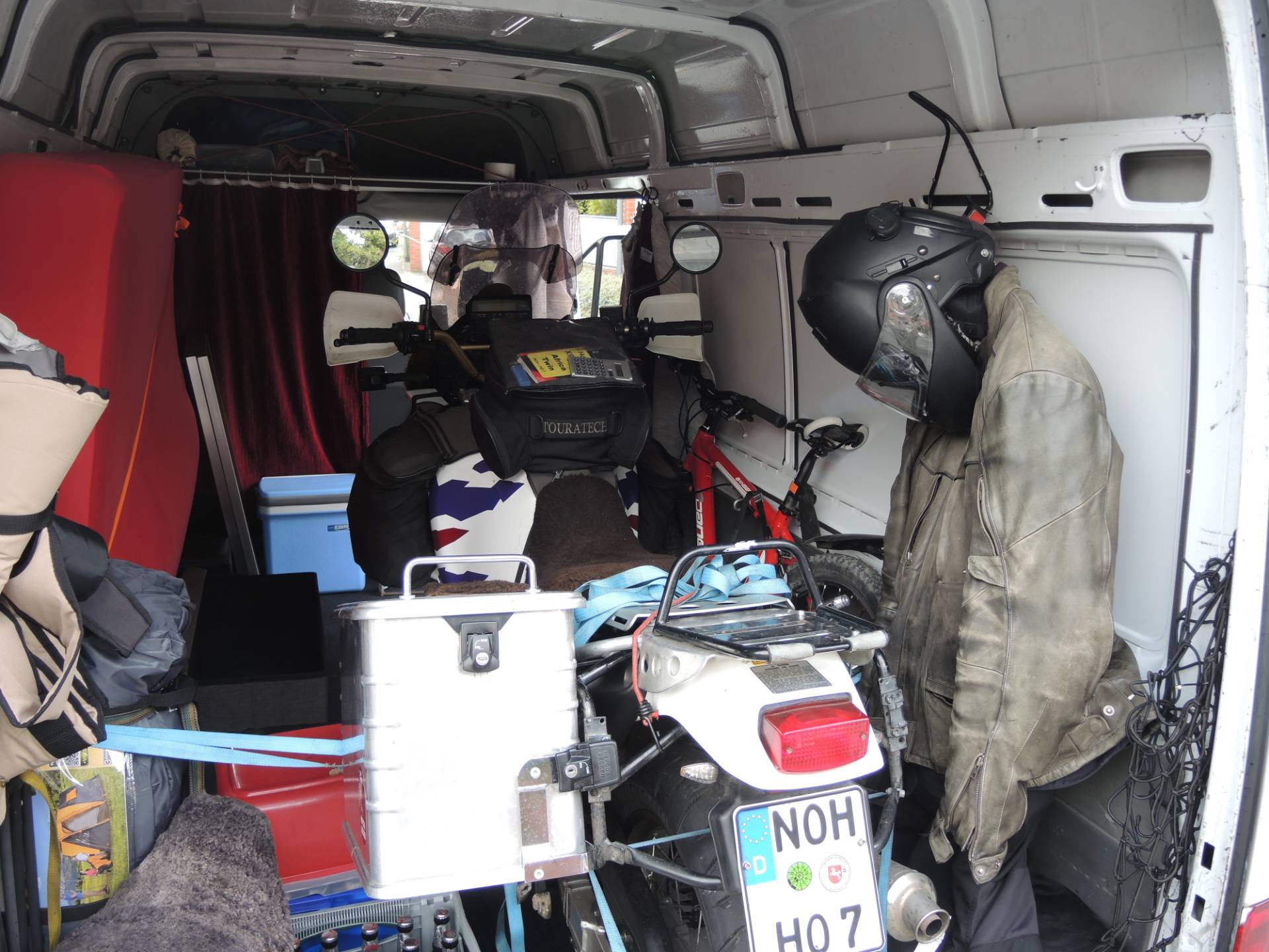 Moped wird über Alurampe reingefahren, steht in ner Wippe und wird verzurrt. Hochkant an der Seite steht eine anständige Matratze,