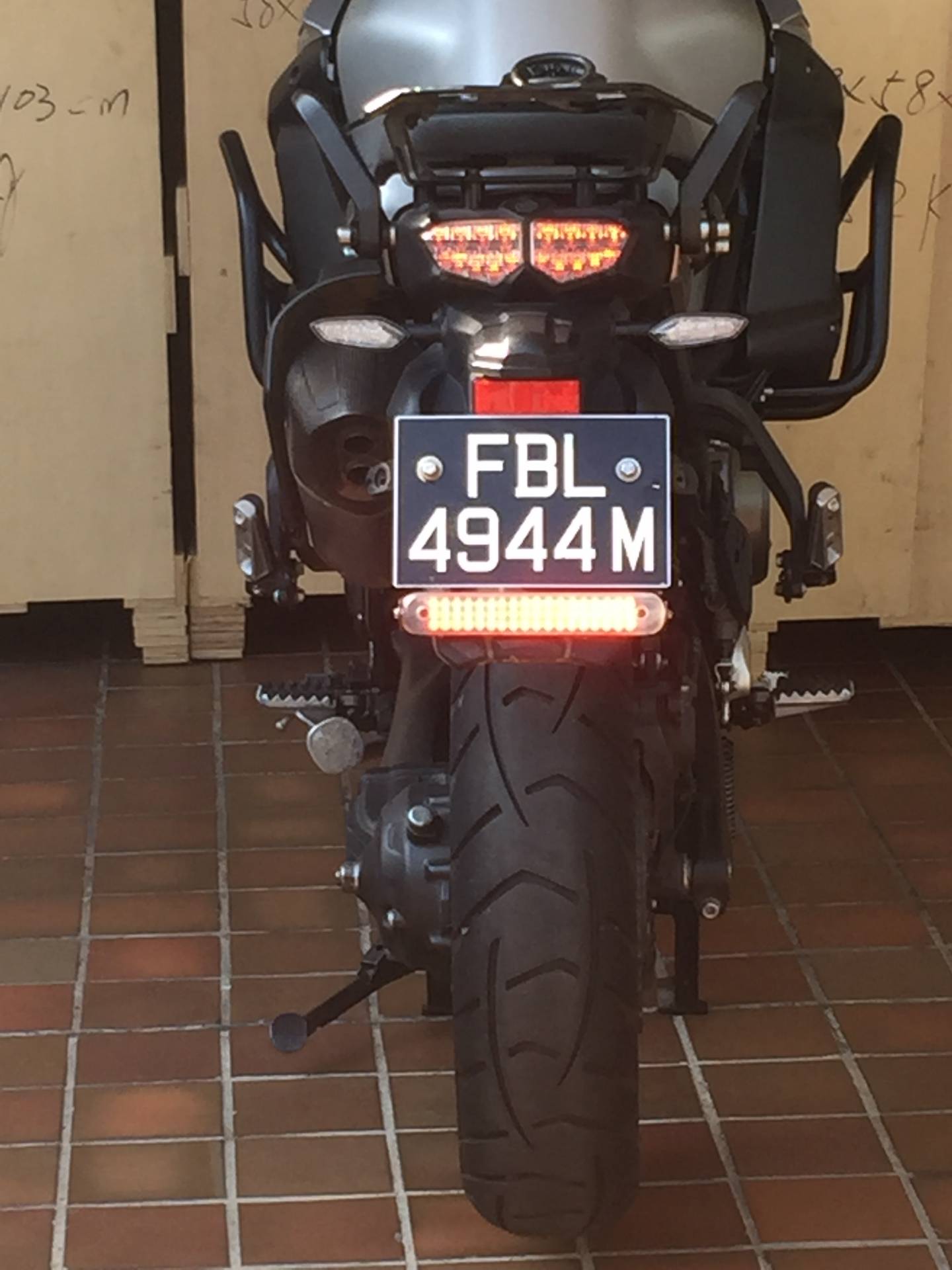 Ich finde das originale Rück/Bremslicht der Super Tenere ein wenig schwach speziell bei direkter Sonneneinstrahlung. Ich war vor einem Jahr fast von einem tieffliegenden Auto auf der Autobahn abgeschossen worden, der Fahrer hat mich schlichtwegs übersehen. Nach diesem Zwischenfall habe ich ein zusätzliches Rück/Bremslicht montiert (Firma Admore, unmoduliert) und bin sehr zufrieden damit. Meines Erachtens ist dieses Teil einen Beitrag zur besseren Sicherheit.