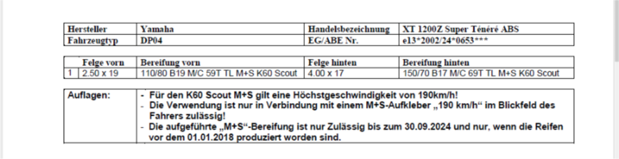 "Da die Maschine eine EU-Homologation hat können Sie auch M+S gekennzeichnete Reifen mit nicht ausreichendem Speedindex einsetzen, also auch nach 2017 hergestellte K60Scout."