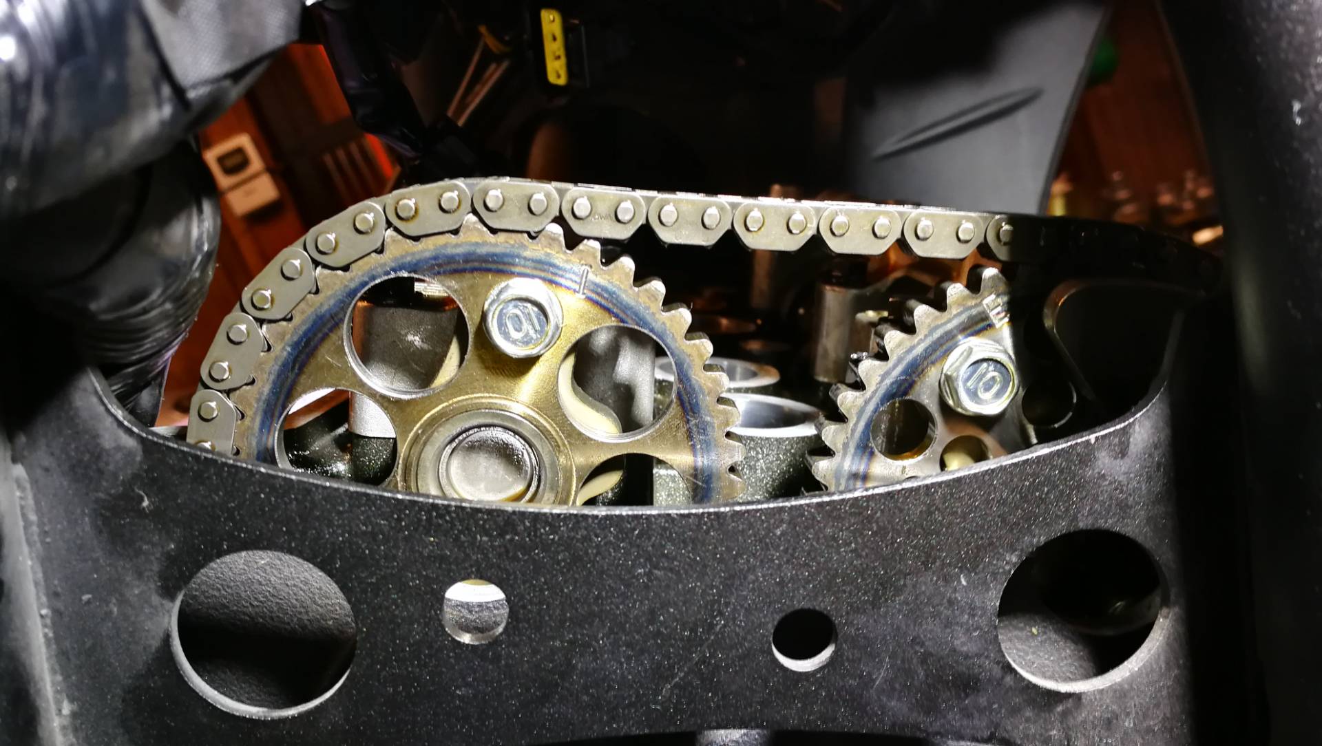 Einbau der Auslassnockenwelle gem. Handbuch, Kurbelwelle ausgerichtet (Strich über K), wenn ich nun die Steuerkette stramm drüberlege, zeigt der Zahn direkt rechts am/vom E der Nockenwelle nicht in ein Zwischen-/Innenglied, sondern in ein Aussenglied. Ich kann nun zwar sicherlich trotzdem 4,5 Glieder zur I Markierung der anderen Nockenwelle abzählen, aber ob das korrekt ist.