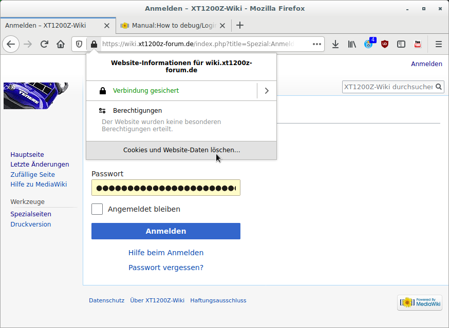 2. Cookies löschen (Achtung, vorher sicherstellen, dass man die aktuellen Passwörter fürs Forum und fürs Wiki weiß!). Bei Firefox und Chrome geht das über das Schloss-Symbol links in der URL-Leiste: Ansonsten gern alle erfolgreichen und erfolglosen Logins melden, damit wir einen Überblick kriegen - so viele Wiki-User sind es ja nicht.