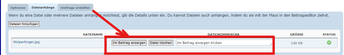 In den Beitrag klicken an der Stelle wo das Bild angezeigt werden soll und wie im Bild dargestellt auf "Im Beitrag anzeigen" klicken.