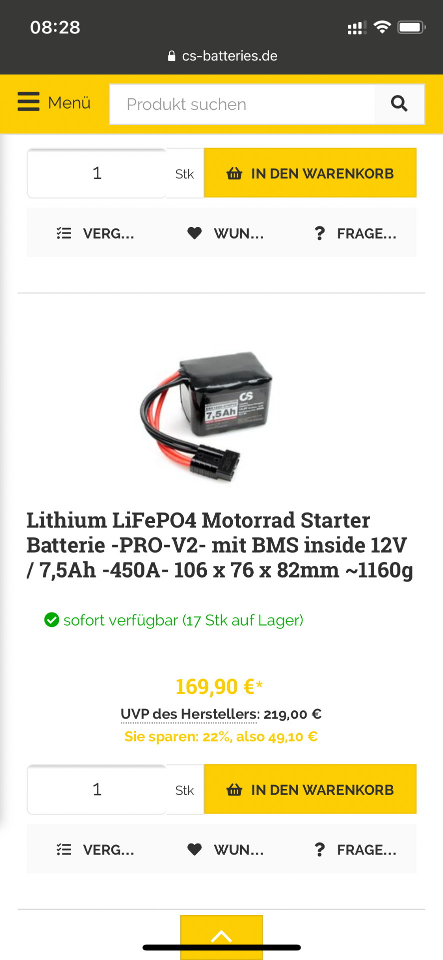 Bei 82 Kg mache ich mir keine Sorgen.Südwestpfälzer hat geschrieben: Mi 9. Dez 2020, 14:28 Also die Gewichtsersparnis macht schon Sinn... mit LiFePO kann man sich rund 2kg mehr Weihnachtsspeck anfuttern![]()