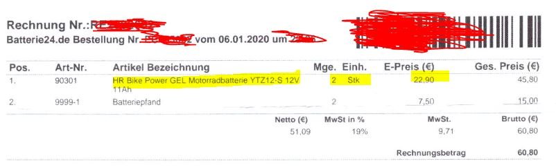 Ich habe im Januar 2020, nachdem unsere Originalen aus 03/2015 verreckt sind gegen HR Bike Power GEL YTZ12-S mit 11Ah für 22,90 €/Stück von Batterie24.de gewechselt. Tja, was soll ich sagen ...
