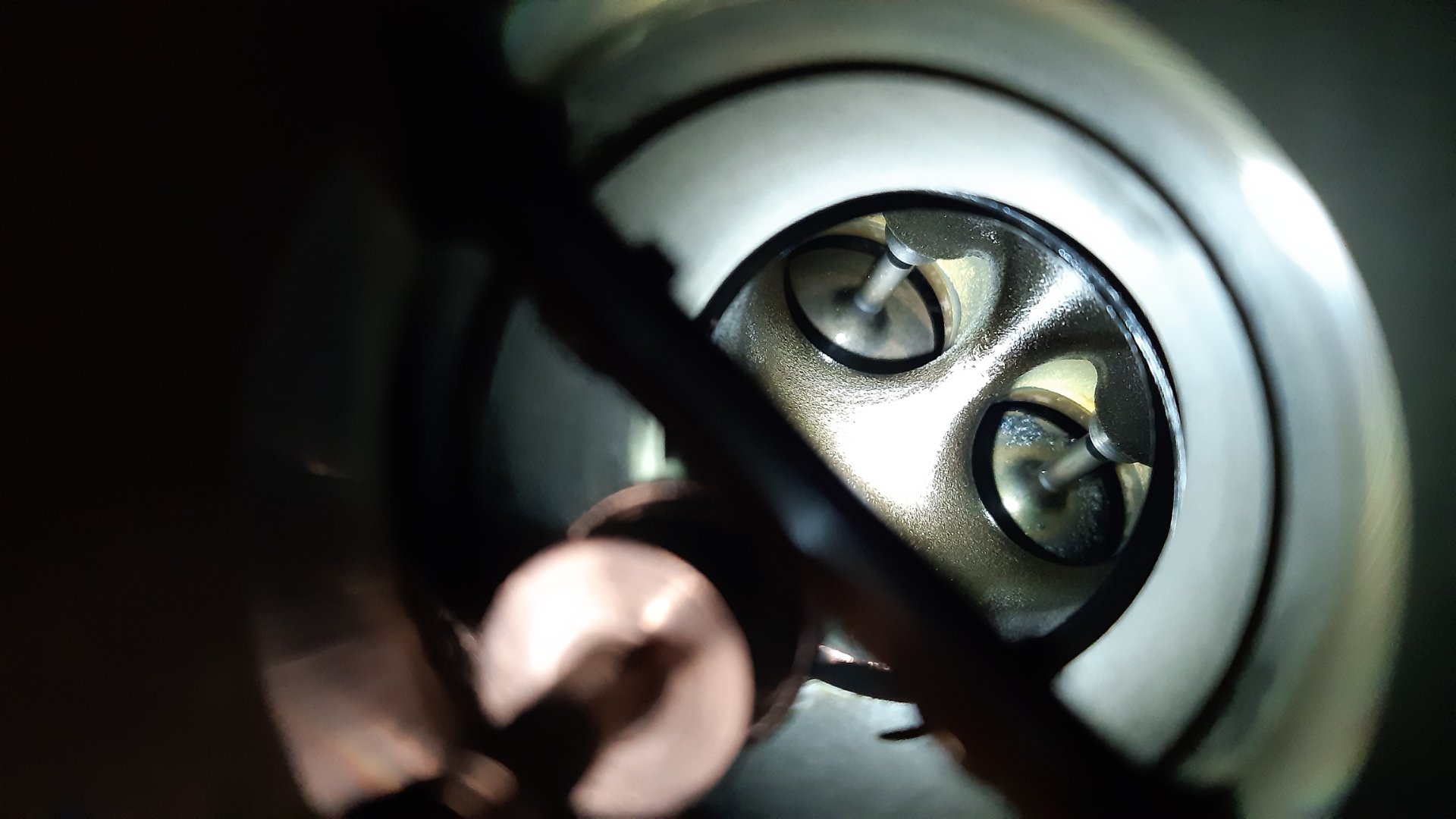 Ablagerungen findet man auf den Ventiltellern nach 60.000 km immer. Deren hier unterschiedliche "Materialstärke" kann ich schlecht abschätzen - auf dem unteren Bild ist der Teller des linken Ventils blitzblank, dagegen ist auf dem oberen Bild der Teller links etwas stärker verkokt. Es beschränkt sich überall auf den Teller, schon die Radien in die Schäfte sind sauber. - Aus welchem Anlaß hast Du da reingeschaut