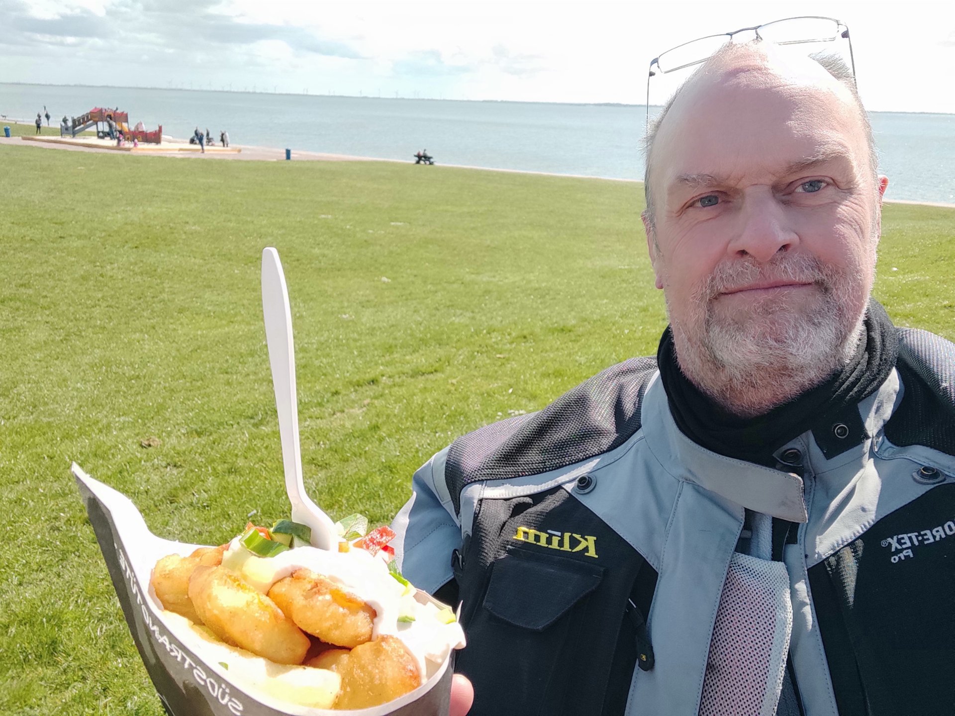 Ein Kaffee irgendwo bei Vechta, eine "Südstrandtüte" (Kartoffelecken mit Kibbeling) am Südstrand in Wilhelmshaven und eine Pinkelpause irgendwo.