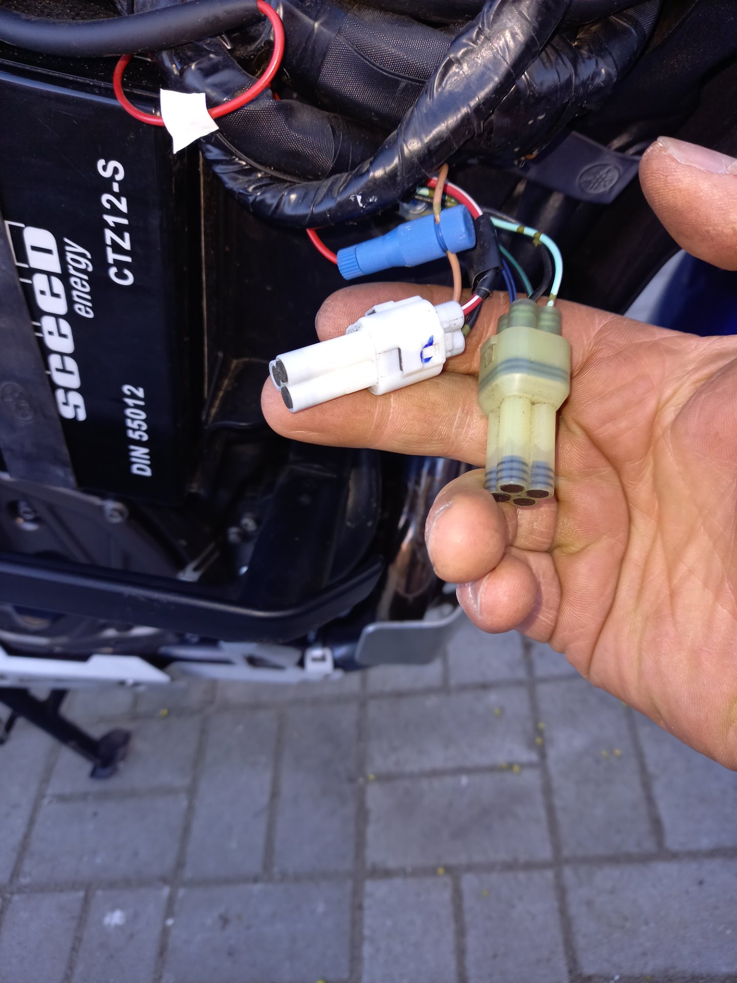 Zum Glück lagen dem Stecker die entsprechenden Flachstecker V-19385 bei. Diese habe ich auf die Anschlüsse des SW-Motech Sets gecrimpt und habe diese "pur" in den verbauten 3-fach Stecker eingesteckt. Macht klick, sitzt, ist fest. (Wenn man bei X-mas Motorcycle Electrics nach der o.g. Steckernummer sucht, findet man die Kleinteile gleich am Anfang der Suchergebnisse).