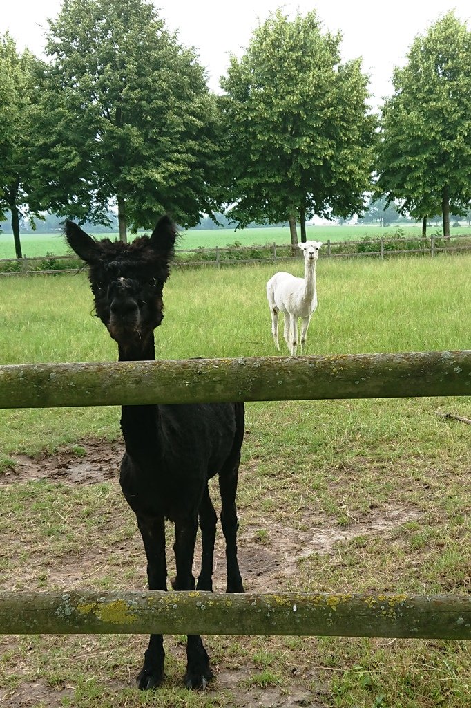 Hat das schwarze Alpaka wirklich noch Hals und Kopf? Irgendwie sieht das im 3. Foto so aus, als wäre der Teil über der oberen Zaunlatte mit photoshop aufgesetzt und der Beweis findet sich auch im 2. Foto. Da fehlt doch was. Das Weiße guckt auch schon ganz entgeistert.