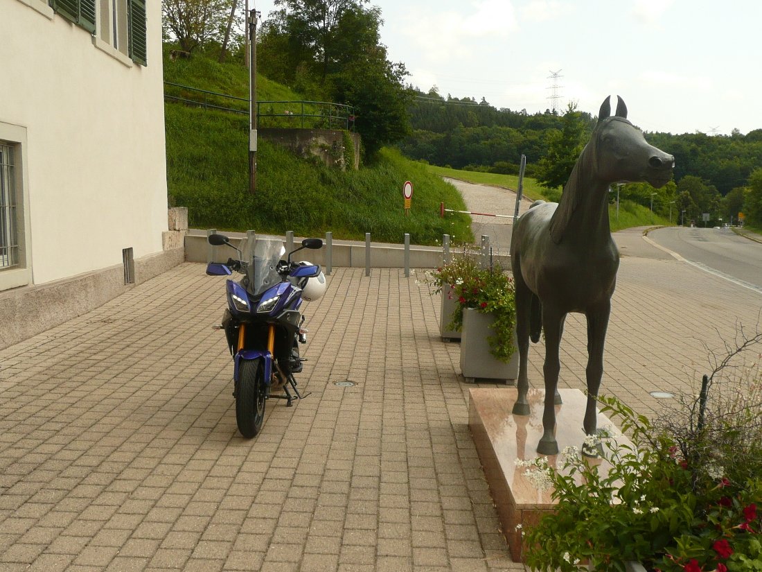 In Marbach steht eine Bronzestatue des einstigen "Originalaraberhengstes" Hadban Enzahi, den das bekannte dortige Gestüt 1955 erworben hatte. Das arme Tier starb 20 Jahre später an den Folgen eines Hitzschlags. Die bronzene Statue sollte nicht darüber hinwegtäuschen, daß es ein Schimmel war. - Mein Fotographieren machte Passanten aufmerksam. Ein Radler meinte freundlich "Da stehen stark unterschiedliche PS-Zahlen beieinander" - allerdings.