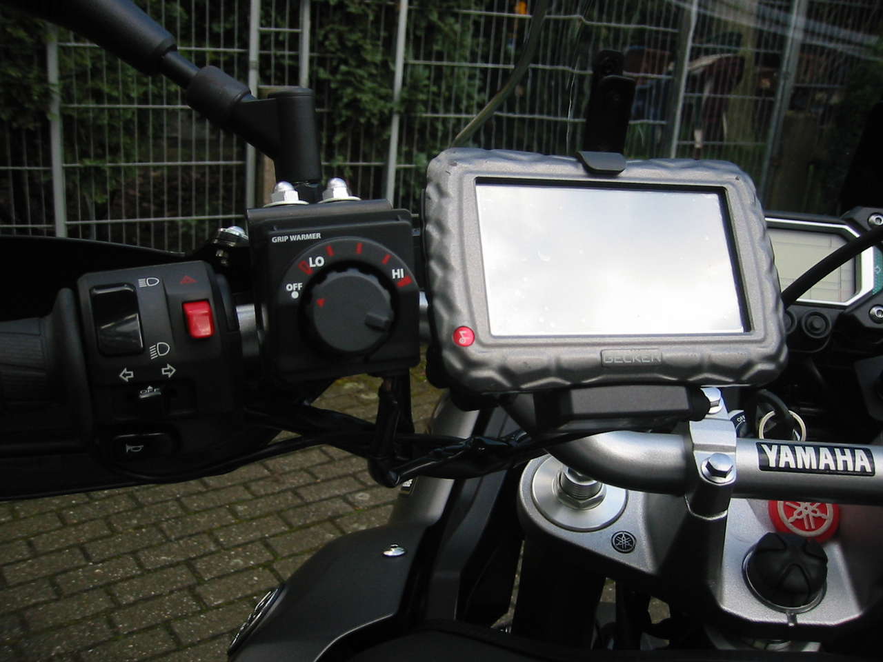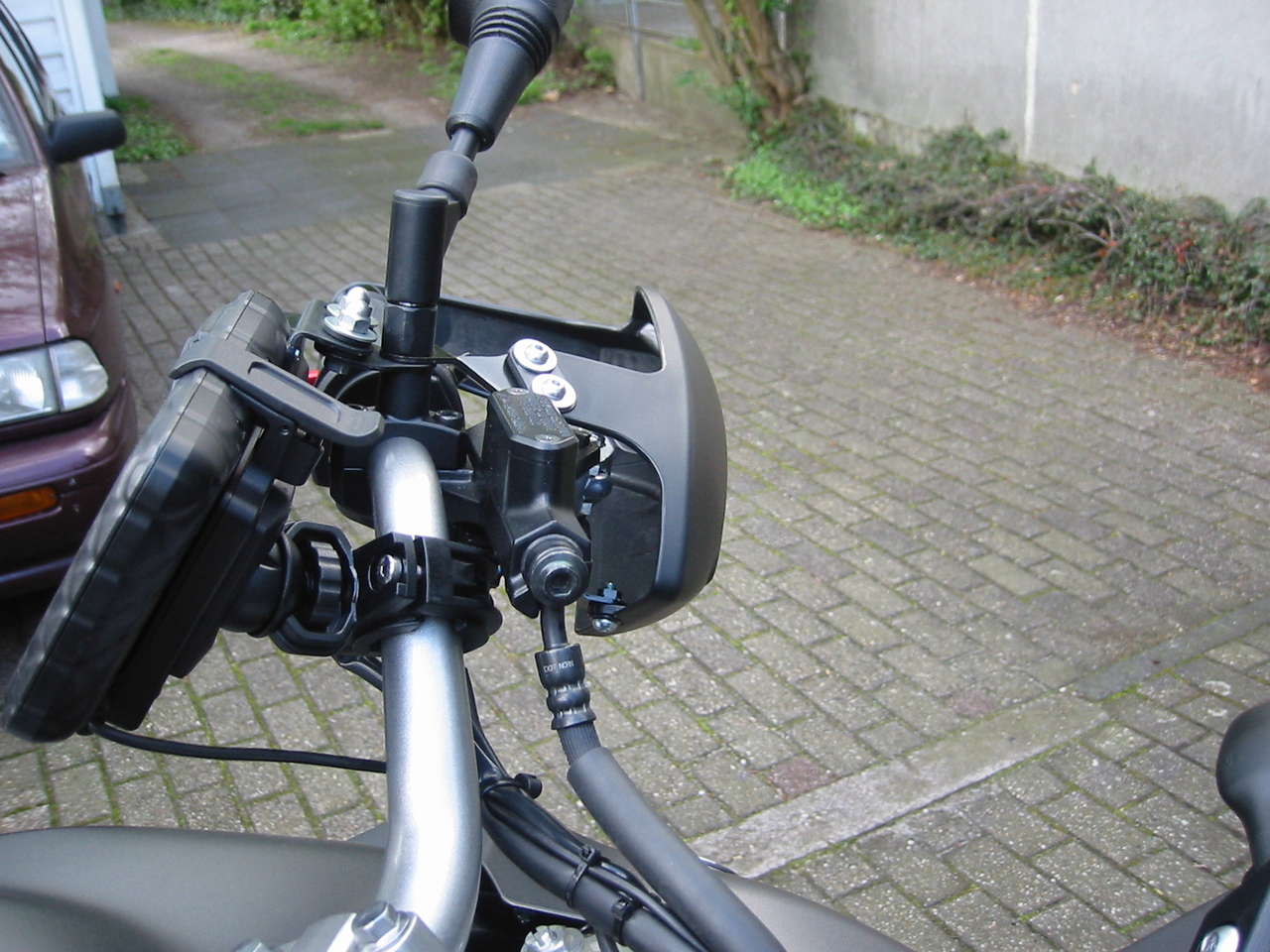 Bis gestern hatte ich mein Garmin Zumo 220 mit der Originalhalterung über das RamMount-Kugelsystem am Lenker montiert. Den Strom habe ich über die Steckdose im Cockpit mittels Kabel/Stecker bezogen. Grundsätzlich war ich mit der Anwendung während der Fahrt zufrieden. Das Display ließ sich den Lichtverhältnissen entsprechend ausrichten und war stets gut lesbar. Was mich jedoch störte war der Umstand, dass man der evtl. Langfinger wegen, die ganze Installation beim Stehenlassen des Bikes immer komplett abmontieren und dann für die Weiterfahrt wieder anmontieren musste.