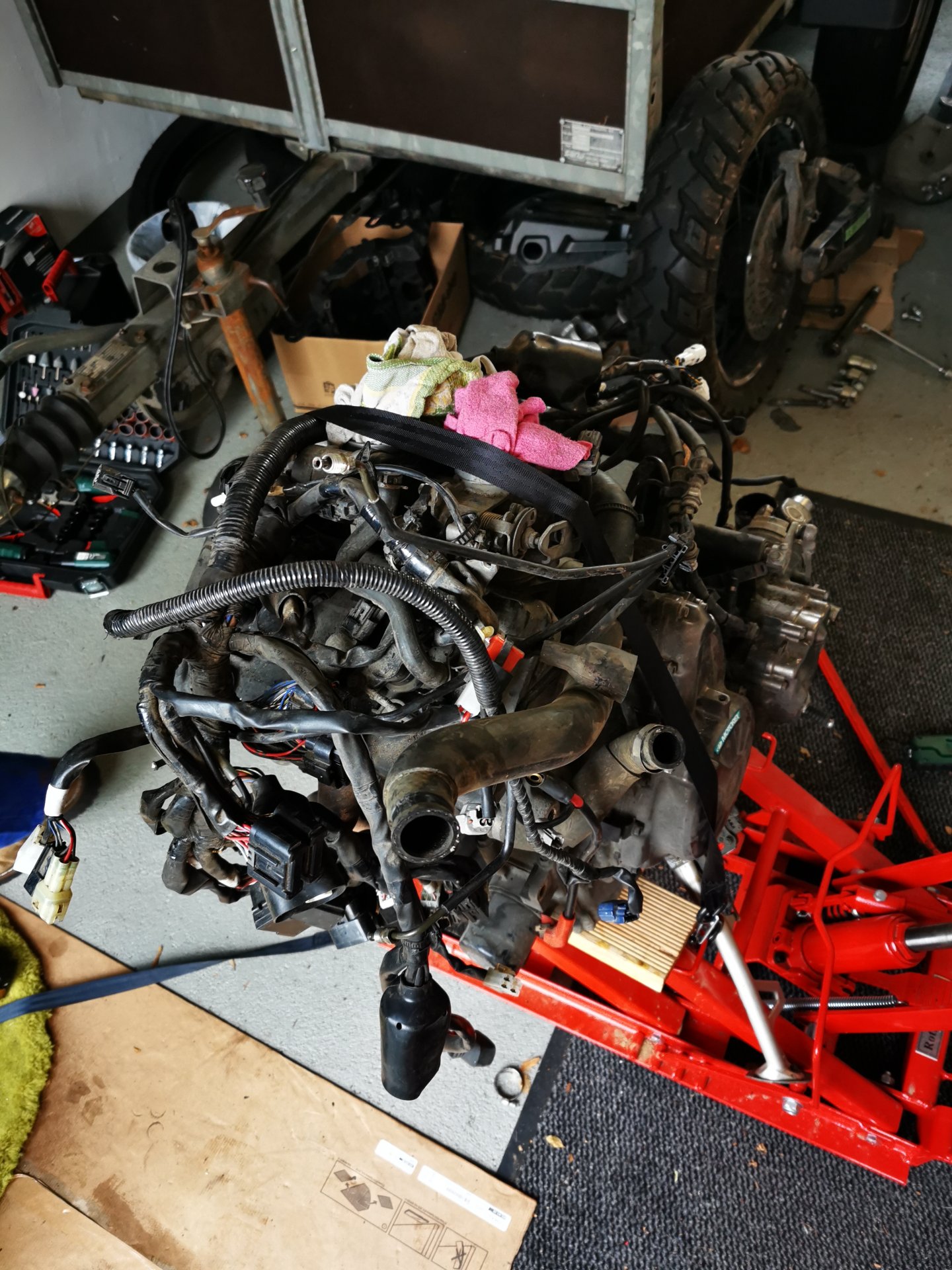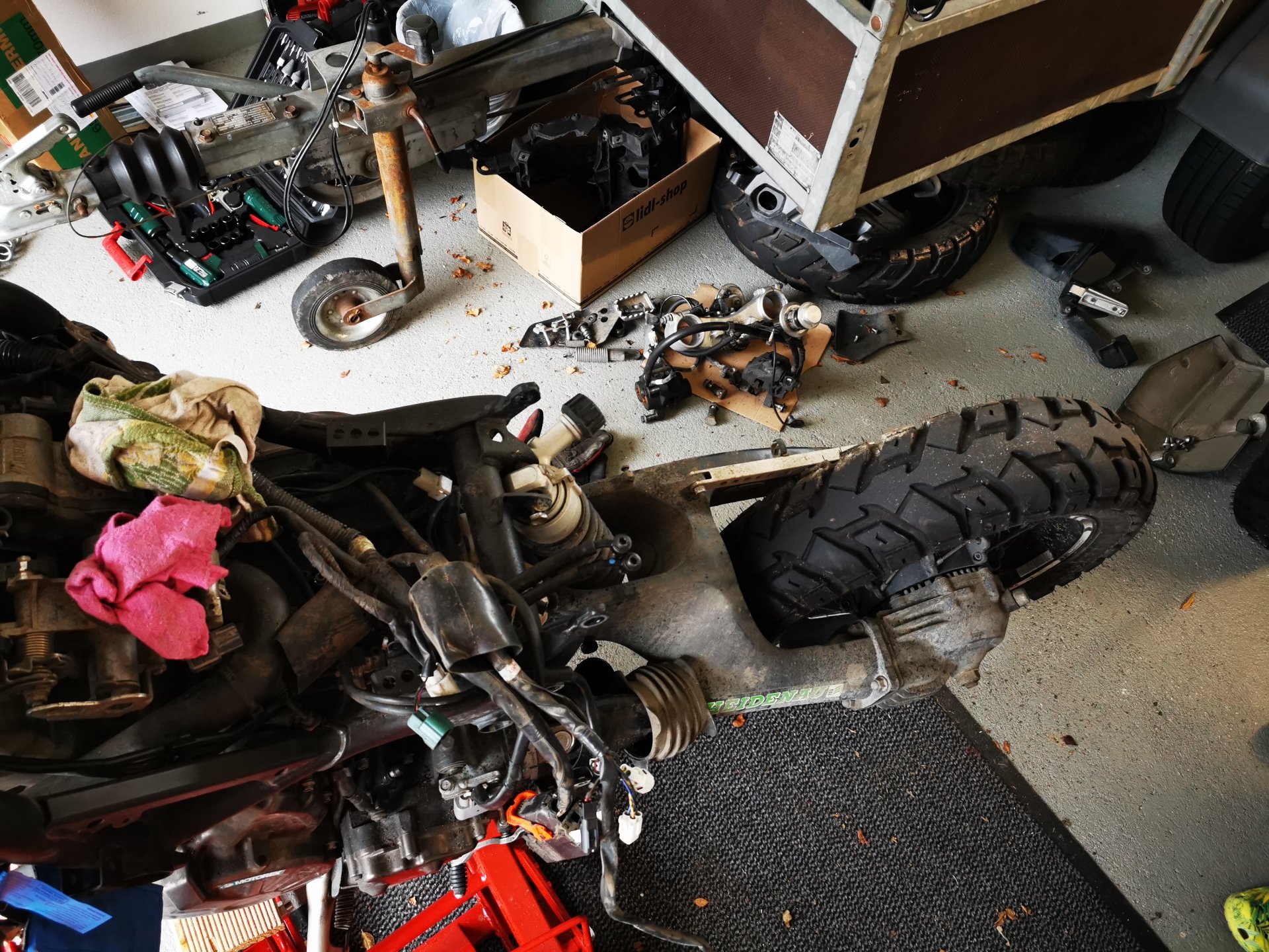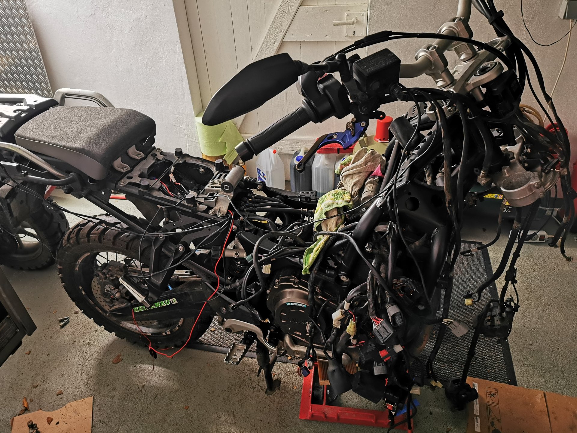 Nach dem am Wochenende die Dicke gestrippt wurde, bis auf den Motor alles weg kam, der Rahmen raus und rein, Schwinge und Heckrahmen wieder dran ist geht es ab morgen an die Elektrik. Aber ich habe auch geflucht.