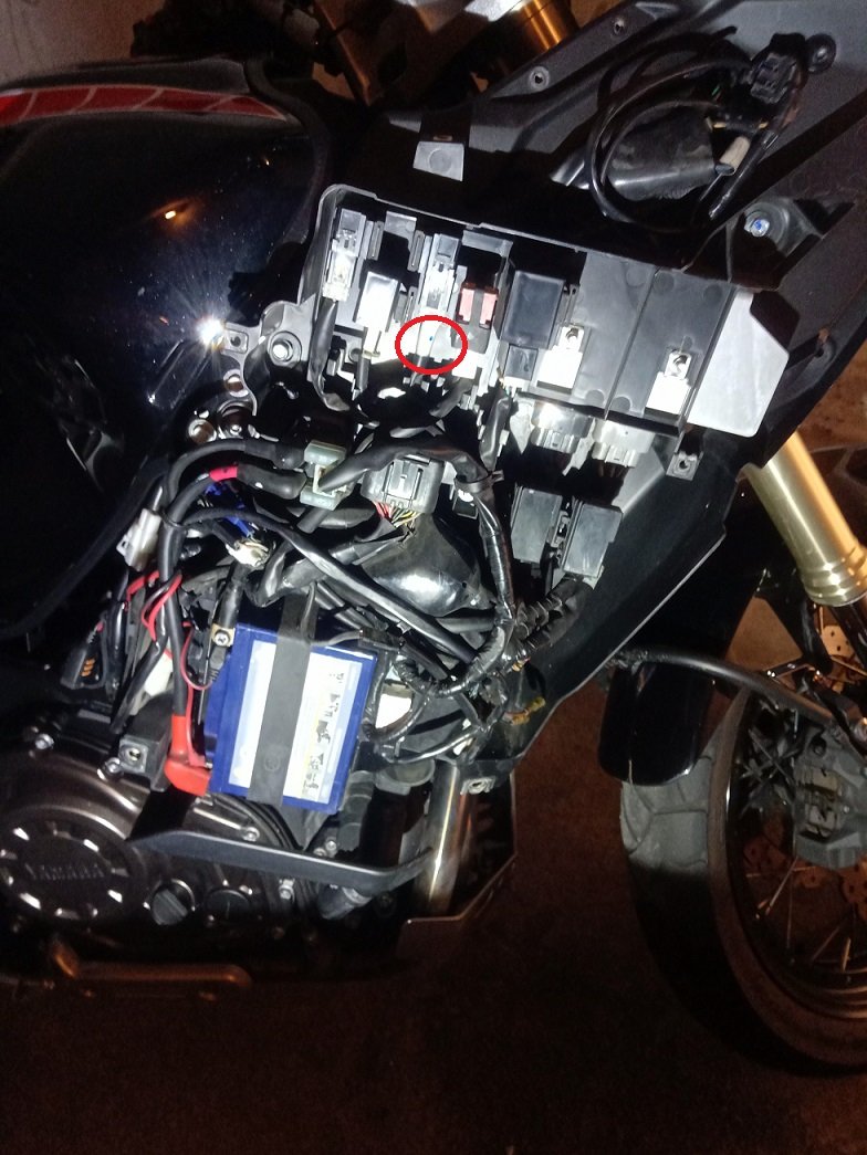 Hab ich also heute vor einer neuerlichen kleinen Ausfahrt erst mal die rechte Verkleidung runter genommen und die Sicherung gecheckt. Sah gut aus, wurde aber trotzdem ersetzt. Dasselbe: die Scheinwerfer bleiben dunkel.