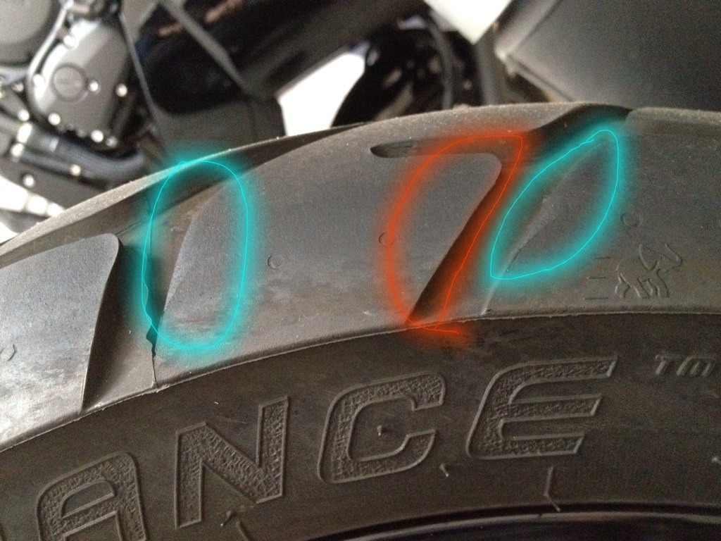 In dem blau gekennzeichneten Bereich ist der Stollen an der Kante stärker abgenutzt und das Profil wird dort weniger. Ich hoffe das kommt auf dem Bild hervor, so dass ihr es nachvollziehen könnt.