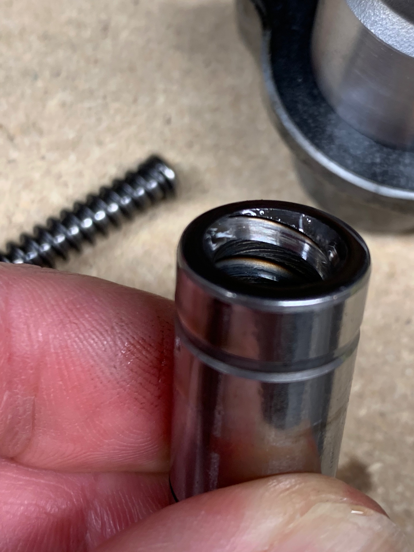 Man sieht schön, wie Yamaha sich das gedacht hat. Hier mit Gewinde gelöst, sodass der Spanner ohne Öldruck nicht mehr zurückfahren kann. Die Feder drückt ihn konstant in Richtung Kette, ein einfaches Zurück gibt's für den Druckbolzen so nicht mehr.