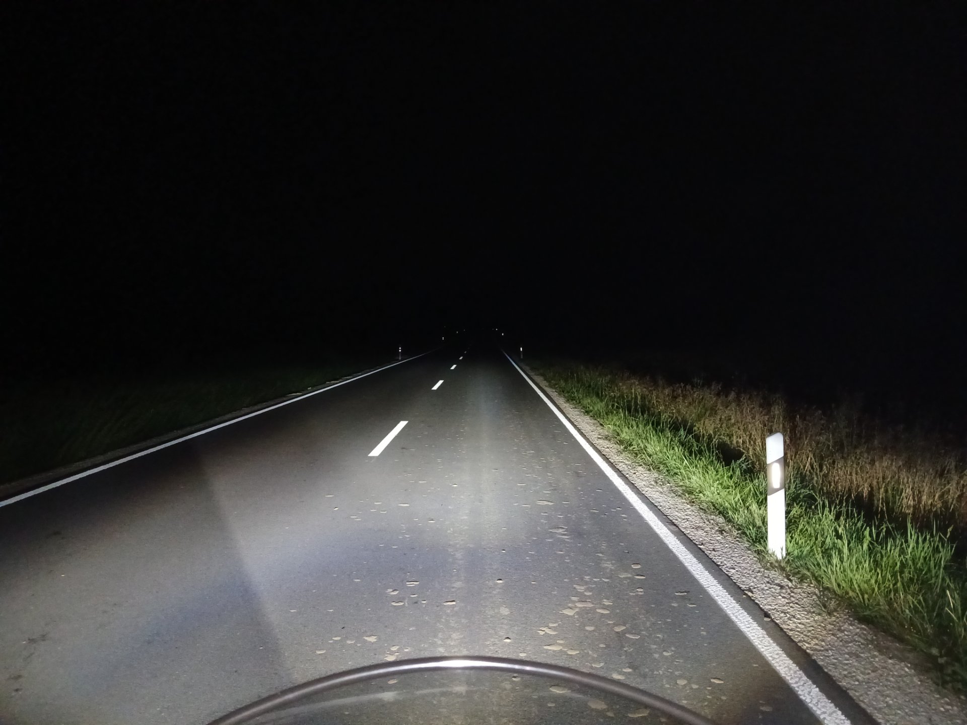 Am Wochenende bin ich jetzt wirklich 1 Stunde bei stockdunkler Nacht unterwegs gewesen. Was soll ich sagen, die Straße war jetzt eindeutig besser beleuchtet als vorher, auch neben der Straße! Klar, Kurvenfahrten/-ausleuchtung sind noch immer schlecht, da ändert das Leuchtmedium wenig. Ich habe mich viel sicherer gefühlt, nachts unterwegs zu sein. Das Fernlicht fand ich jetzt wenig hilfreich direkt vor einem, hat eher alles 1 Stockwerk höher angeballert. Und es war trocken, keine Ahnung wie die Ausleuchtung bei Regen gewesen wäre, Test folgt noch...