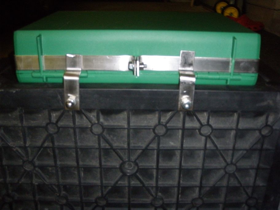 Befestigung mit rostfreiem Halter rund um das Köfferchen, unten habe ich es in den vorhandenen Löchern der Originalkoffer verklemmt. Das sind ca. 3 cm lange SChrauben mit Gummipuffer dazwischen. Es ist also jederzeit wegnehmbar um dem TÜV die Freude nicht zu gönnen.
