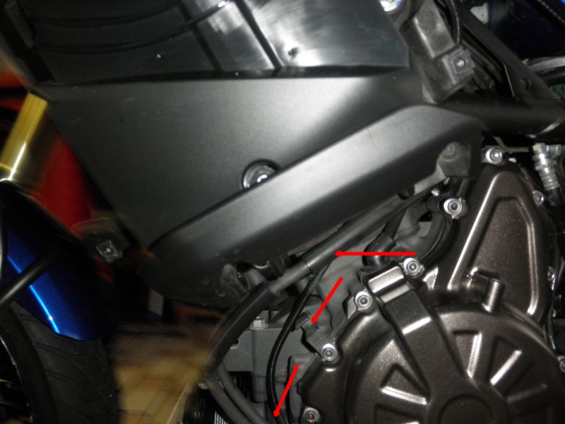 5. Tank hochstellen und die Stecker lösen sowie die Benzinleitung an der Einspritzanlage entfernen. (Geht einfacher, dafür muss die schwarze Sicherung nach hinten gezogen werden und dann auf beide Drucksicherungen drücken und abziehen.) Tank wieder nach vorn ablegen und hintere Schraube rausdrehen, jetzt kann der Tank abgehoben werden. Beim Ablegen des Tanks darauf achten, dass die Anschlüsse nicht belastet werden. (Ich lege ihn immer auf zwei Dachlatten.)