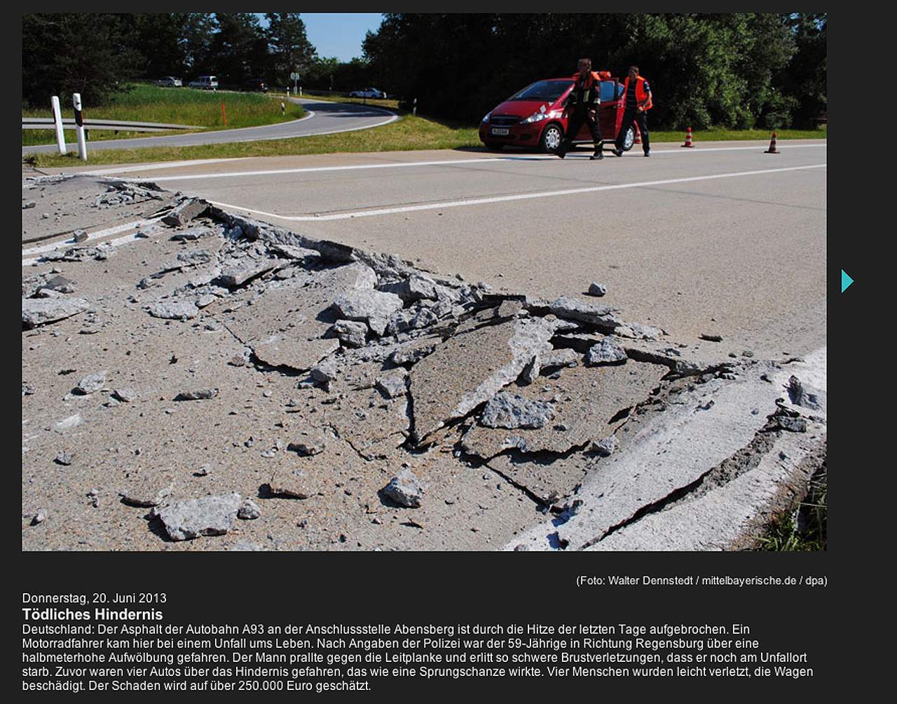 Irgendetwas kam heute nachmittag im Regionalradio, daß die momentane,extreme Feuchte des Erdreichs direkt darunter dies so stark ausgelöst haben muß. Normale Fahrbahnwölbungen sind ja nicht so extrem.