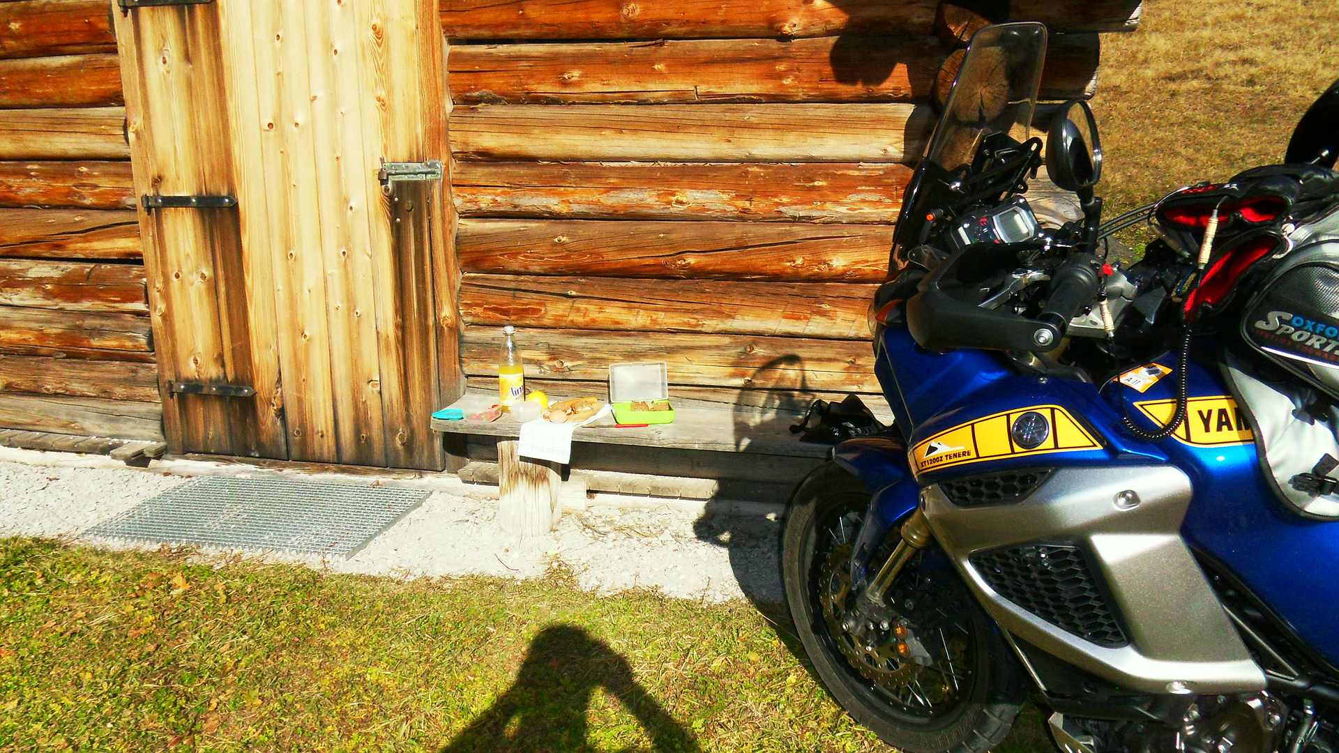 Also rauf zum Sellajoch für das Wetter sehr wenig Verkehr und auf der gerammten Tour so gut wie keine Biker?? ( schon Winterschlaf ) und nur 2 Busse. Überall noch n paar Bilder geknipst ( Hält aber ungemein auf ). Oben am Selle noch 13°. Dann weiter zum Pordoi mit seinen Berüchtigten Kurven und Kehren ein genuß und der knackig blaue Himmel dazu so macht das fahren Spaß aber gerade am Pordoi sind auf der Schatten Seite doch viele glatte stellen vom Schmelz Wasser des über die Straße läuft an Arabba vorbei weiter zum eher beschaulichen Campolongo mit schönen geschwungenen Kurven. Dort fand ich auch eine Hütte bisschen abseits zum Brotzeit machen. Auf hartem rutschigem Boden mit feuchtem Gras na ja ging grad so. Weiter nach Corvara di Badia dort fängt das Grödenerjoch an das sein Ende auf der selben Stelle hatt wo das Sellajoch anfängt. Kurven mäßig fange ich lieber mit dem Sellejoch an. Aber auch die An und Abfahrt auf der SS242 hat es in sich mit vielen Kurven. So dann in Sterzing noch schnell mal zu Penserjoch und Jaufenpass geschaut beide offen. Schwup übern Brenner , Innsbruck, Zirllerberg , nach dem Garmischer Tunnel dann der 1ste Stau 2 spurig bis nach Oberau dann 1 spurig bis zu Autobahn nach München. Möcht nicht wissen wies am Ende in München aus geschaut hat. Aber ich bin ja in Oberau links noch Oberammergau und dann Heim auf fast leeren Straßen.