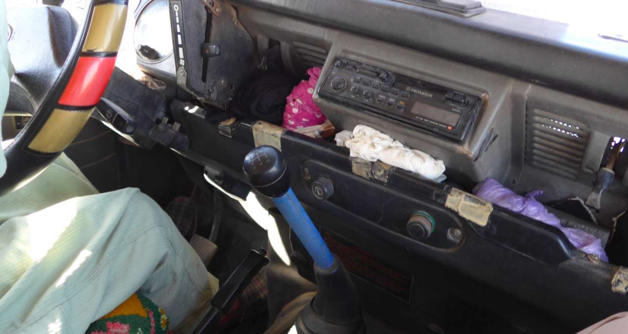 Die Geländewagen liefen im Konvoi ein, alle mit offenen Fenstern. Aha, wohl doch keine Klimaanlagen. Die Verteilung der Sitzplätze verlief relativ chaotisch. Keiner wollte mit dem betagten Land Rover mitfahren. Ich schnappe mir den Beifahrersitz im Land Rover und stellte fest, dass dieser schon einiges erlebt haben musste. Über 342.000 km standen auf dem Kilometerzähler.