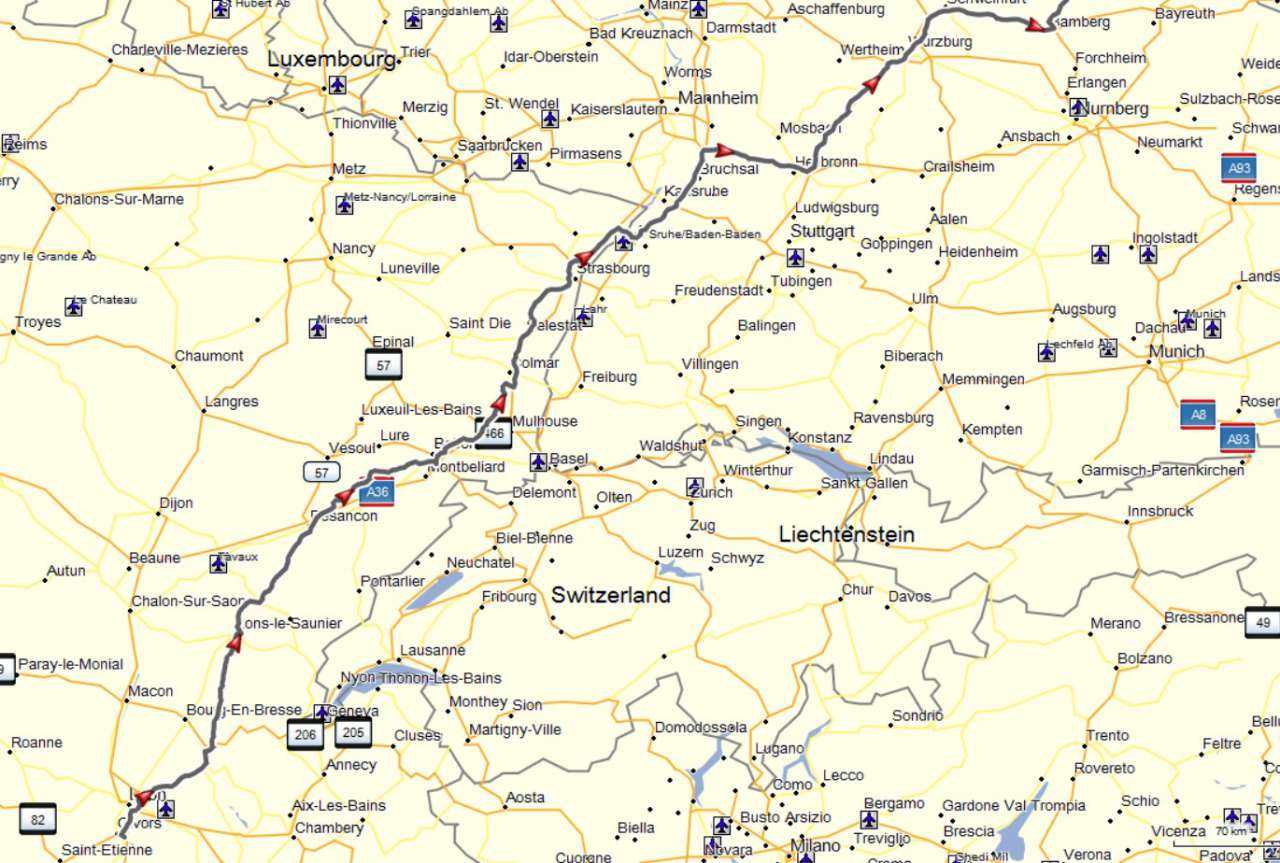 Ich verabschiedete mich von den Leuten, die während der Reise etwas näher kennengelernt hatte und machte mich auf meine Route durch den Jura. In Ambérieu-En-Bugey verwarf ich meine Planung, da es im Jura total nach Regen aussah. Ich stelle mein Navi auf schnellste Route und Mautstrecken vermeiden und wurde durch die Ausläufer des Jura geführt. Zu meiner Verblüffung nicht über Nationalstraßen sondern und kleine Ds mit kaum Verkehr. Bereits nach Oyonnax kam ich in den Regen, der mich bis Besançon verfolgte.