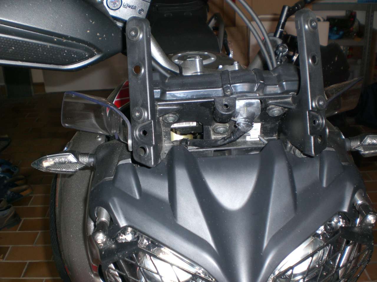 Heute endete nun im positiven Sinne die Erfolgsgeschichte. Das neue 2014er-Teil liegt satt auf dem Scheinwerfer auf, und die dünnen Verschlussstifte gibt es auch nicht mehr. Links und rechts wird das Teil nun geschraubt (mit in die Löcher der seitlichen Windabweiser) und oben (Richtung Tachoeinheit) sitzt es in strammen Verkleidungsstiften mit doppelten O-Ringen. Kein Klappern mehr zu vernehmen; und die seitlichen, kleinen, Flügelchen wirken meiner Meinung nach zusätzlich zur Geräuschreduktion und zur "Luftleitung".