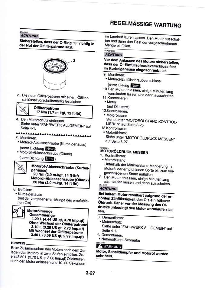 3) Du kannst während das Öl abläuft auch Ölfilter wechseln, Kerzen prüfen/wechseln, Ventilspiel checken, Kühlflüssigkeit wechsel etc.