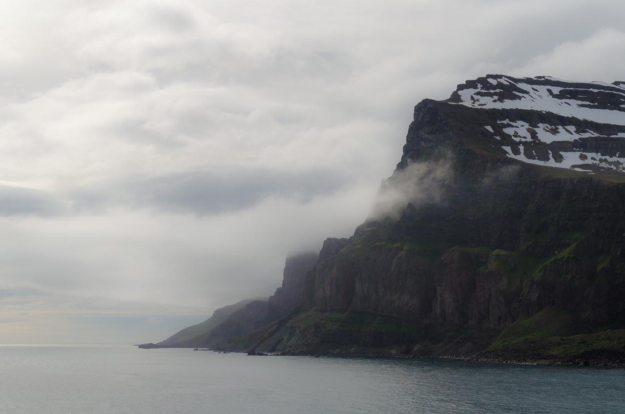 Am Donnerstagmorgen kündigt sich die baldige Ankunft durch ein verschärftes Hauen und Stechen am Frühstücksbuffet an. Jeder will sich vor dem Ausladen noch einmal den Bauch vollschlagen. Als eine der Kaffee-/Teemaschinen ausfällt, droht Meuterei. Während ich Baked Beans und Scrambled Eggs mit der einzigen Tasse Tee herunterspüle, die ich ergattern konnte, sind aus dem Fenster bereits die schneebedeckten Gipfel der isländischen Küste zu sehen. Nach dem Räumen der Kabine stecke ich zwangsläufig in voller Montur und halte es nur noch an Deck aus. Der Seyðisfjörður empfängt uns mit schneebedeckten Hängen und rauschenden Wasserfällen unter einem bleiern überzogenen Himmel.