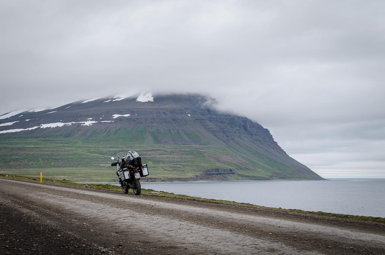 Also weiter entlang der 85 durch eine flache, unspektakuläre Küstenlandschaft. In Bakkafjörður muss ich wieder an Hund und Katz denken, aber immerhin erkenne ich den Campingplatz: ein aufgemotzter Rastplatz mit sanitären Anlagen in einer kleinen Hütte – aber kostenlos. In der Ortsmitte sind ein paar Jugendliche mit Warnwesten und überschaubarem Engagement dabei, die Wiese zu mähen. Anderswo sehe ich das gleiche Bild. Nach Bakkafjördur hört der Asphalt auf, und es geht über eine etwas rumpelige Lehm-/Schotterstraße weiter. In der Bucht bei Fell halte ich an, um mir ein paar Handvoll Studentenfutter einzuwerfen. Auf meiner isländischen Karte ist hier ein Dorf verzeichnet - außer dem Gehöft, wie in Google Street View zu sehen, ist hier aber nix. Mir fällt erstmals die totale Stille auf. Während bei uns immer irgendein Flugzeug oder fahrende Autos zu hören sind – hier gibt es außer meinem Tinnitus gar nichts zu hören. Während ich so im Gras sitze und auf die stille Bucht schaue, wird mir klar, dass ich von der Reizüberflutung, die ich von zu Hause gewohnt bin und die bis vor wenigen Stunden auf der Fähre noch herrschte, erstmal eine Entziehungskur machen muss, um dieses Land richtig wahrnehmen zu können.