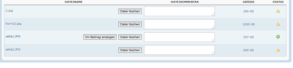 wenn ich eine der unten zu sehenen Anhänge markiere "im Beitrag anzeigen" werden beide (alle) Bilder mit grünem Uploadstatus angezeigt.