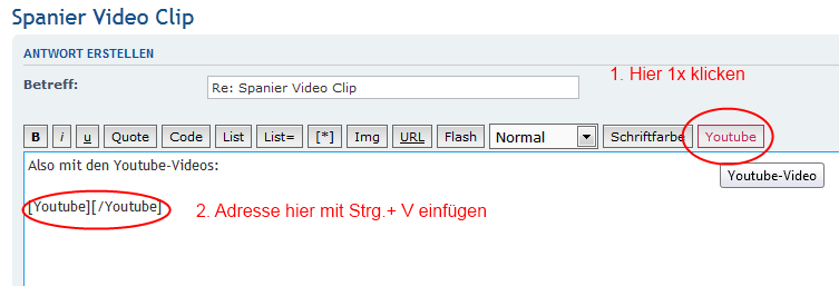 6) Beim Erstellen eines Beitrags im Forum auf den Youtube-Knopf oben rechts über dem Texteingabefeld drücken. Danach ist der Cursor schon zwischen den beiden Youtube-Markern. Also einfach Strg+V drücken, um den zuvor kopierten Link zwischen den Markern einzusetzen: