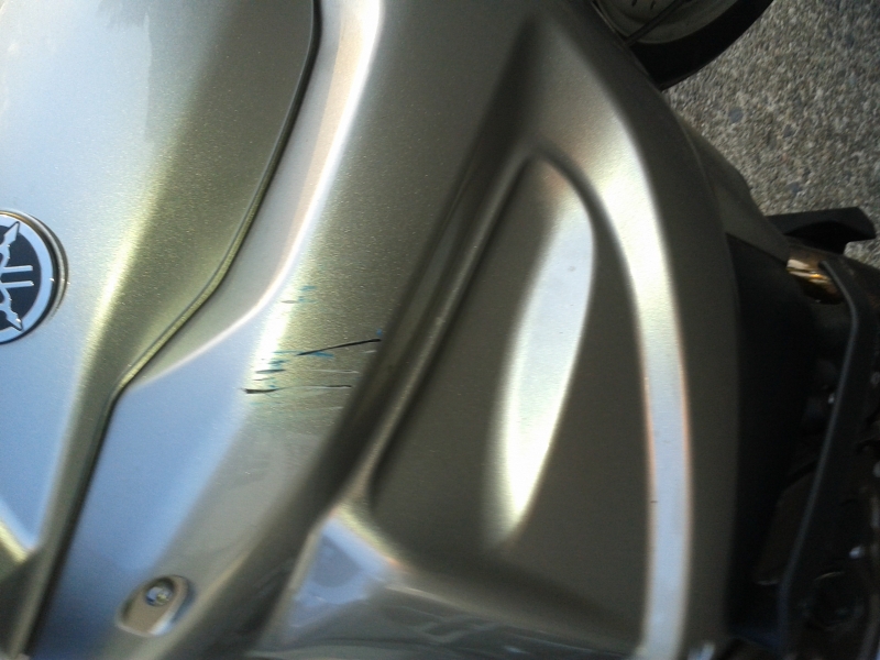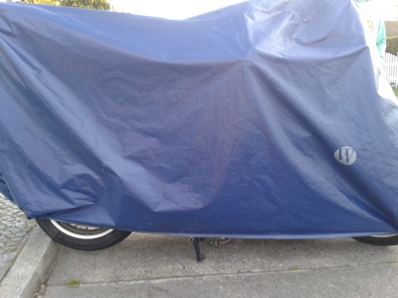 Die Abdeckplane hat nun diverse Durchbrüche durch die Betonfahrbahn, man sieht schön wo die Fußrasten, Spiegel, Lenkerprotektor, Topcase sich durch die Plane gedrückt haben und auch auf der Fahrbahn sind die Spuren der Aufschlagstellen sichtbar.