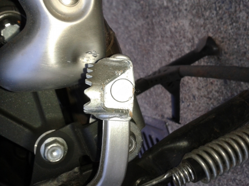 Der Fußbremshebel ist bis zum Hitzeschutzblech durchgedrückt worden.