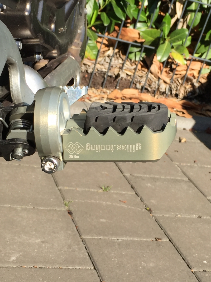 Jetzt hab ich mir die Fußrasten von Gilles besorgt, die mittels Exzenter höher gestellt werden können.