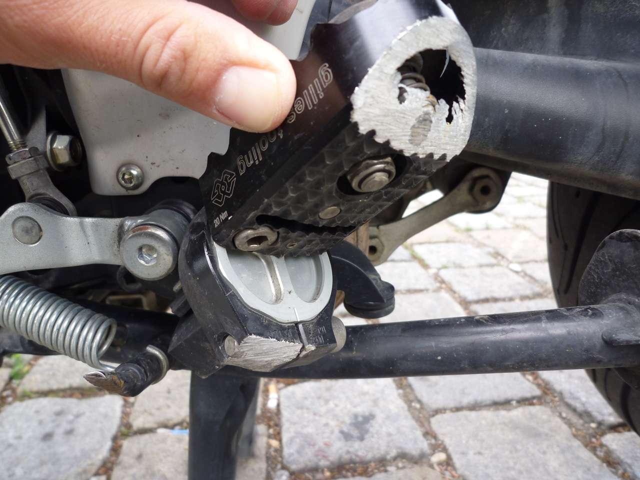 Aber: Durch den Verstellmechanismus bauen die Rasten ca. 2 cm breiter als die originalen. Die Betätigung des Seitenständers ist auf der linken Seite ein bisschen fummeliger. Außerdem habe ich in einer Rechtskurve die neue Raste schon mal ein bisschen angeschliffen :cry: