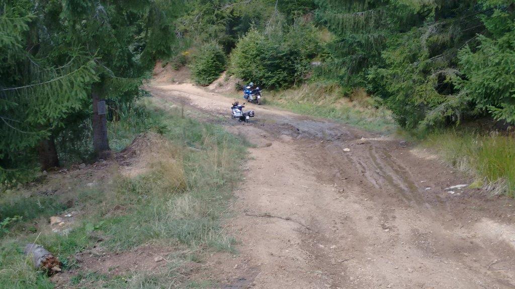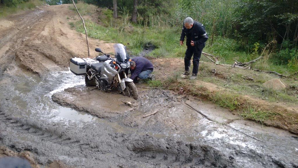 Ja Jungs, das war schon eine unvergessliche Aktion bis die Dicke wieder aus dem Schlamm war. Eines der Highlights unseres Urlaubs. Mein Kumpel wähnte sich auf der linken Seite auf der besseren Seite (was auf dem ersten, der folgenden Bilder auch so aussieht, weil links trocken. Unten war es dann aber bereits zu spät. Wahrscheinlich war er der Auffassung, dass die Pfütze nicht so tief ist. Schuldzuweisungen helfen aber in solchen Momenten auch nicht viel weiter. Gefühlt verbrachten wir drei Stunden in der Wildnis bis Hilfe nahte. Wir versuchten zwar das Wasserloch durch eine mit Stöcken gegrabene Ablaufrinne trockenzulegen, was auch einigermaßen klappte, es lief aber immer wieder vom Hang her Wasser von zwei Seiten nach. Hätten wir einen Klappspaten dabei gehabt - aber wer hat schon beim Moppedfahren einen Spaten dabei? -, dann hätten wir den Schlamm rausgraben können und hätten es vielleicht ohne fremde Hilfe geschafft. Nun ja, ich habe unserem rumänischen Ansprechpartner George über WhatsApp das Bild von meinem Navi geschickt, damit er sich in etwa orientieren konnte, wo wir stecken, im wahrsten Sinne des Wortes