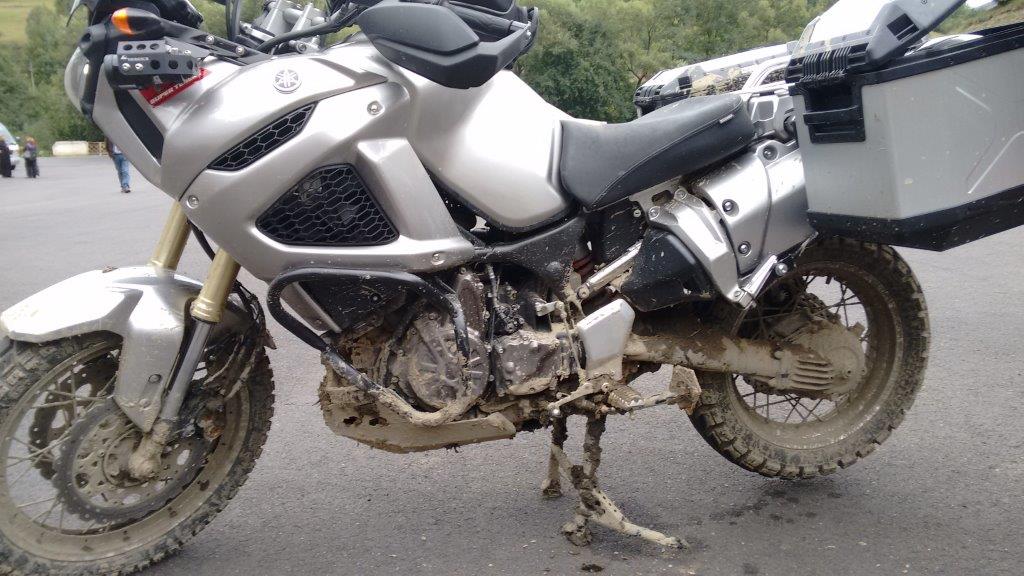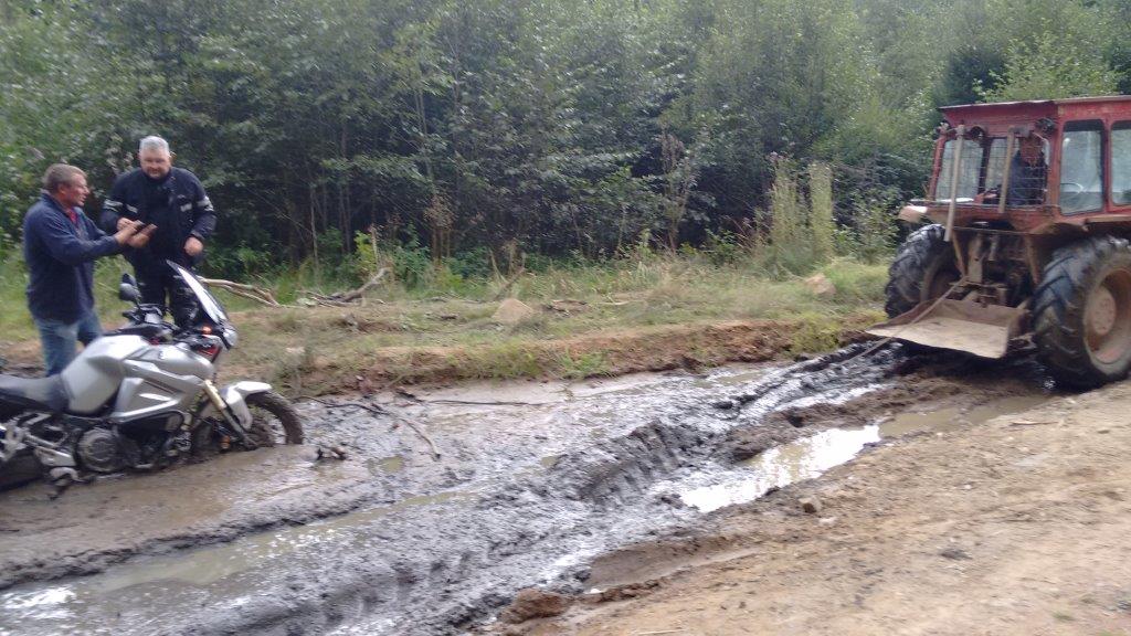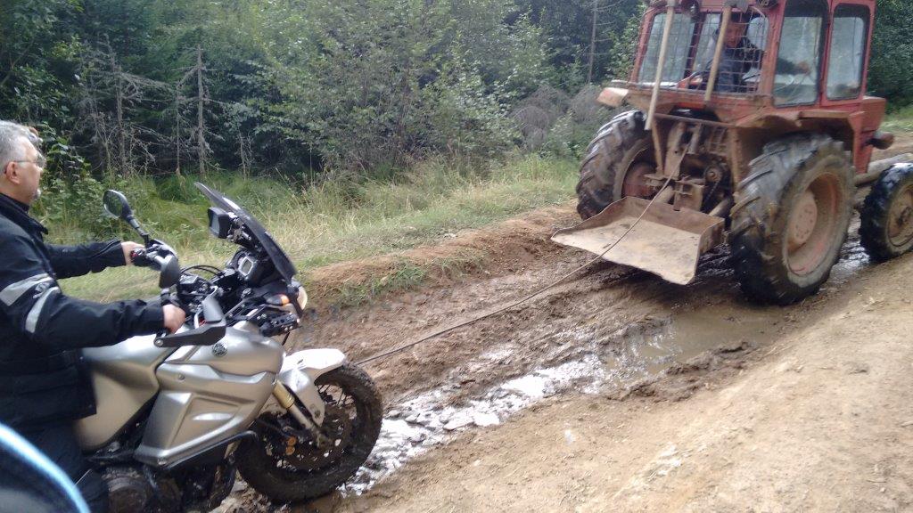 Die Jungs haben das Stahlseil der Seilwinde an den Sturzbügeln angebracht, mein Kumpel hat sich auf das Mopped gesetzt und dann haben sie gemeinsam die Dicke langsam aus dem Morast gezogen. Sicherlich wird diese Aktion noch lange Thema in der Dorfkneipe oder in einer Kirchweihrede sein, wenn es so etwas in Rumänien geben sollte