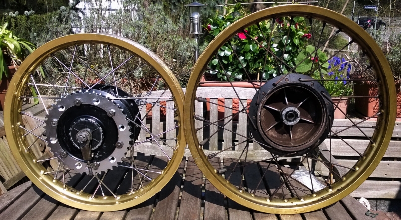 Nachdem ich mir schon 2 Fahrräder zusammengebaut habe und dabei auch die Räder eingespeicht habe, bin ich am letzten WE an mein Bastelobjekt XT 500 gegangen. Ein bisschen Muffe hatte ich schon, zumal meine alte Dame vorne 4 unterschiedliche Speichentypen hat.