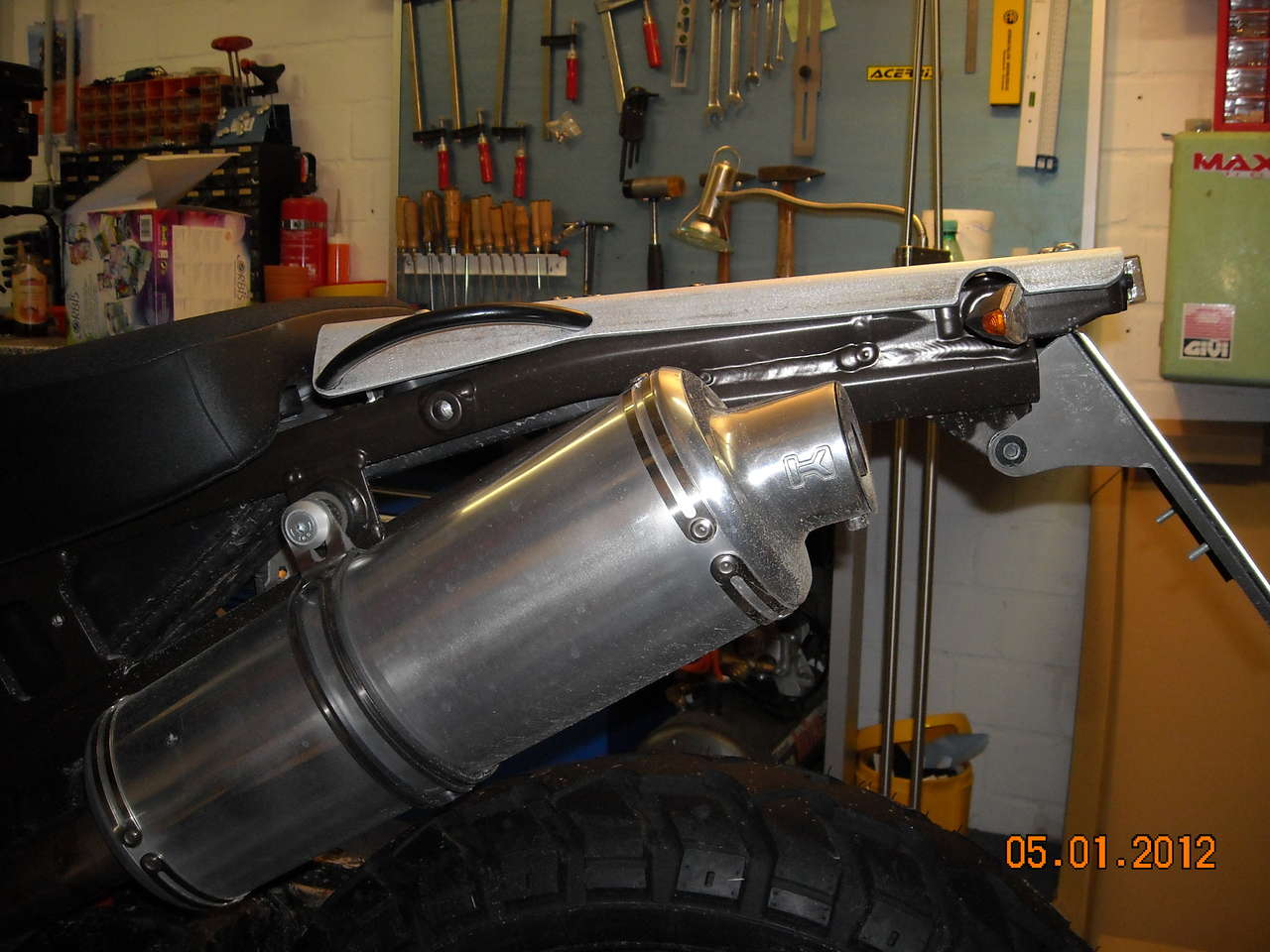Ich habe den Auspuff normal ausgerichtet, wie ich ihn haben wollte, ohne biegen und brechen. Die Krieger-auspuffschelle hat eine sehr schlechte Qualität. Am Heckrahmen habe ich eine 20 mm Hülse als Abstandhalter verwendet. Mit einer langen 8 mm Schraube habe ich den Auspuff befestigt.