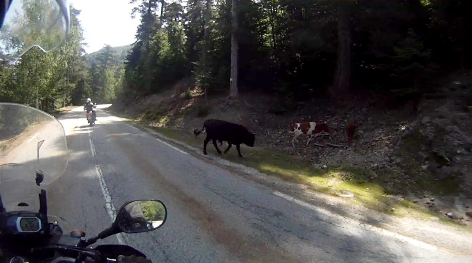 Und genau das war der Plan für Donnerstag. Gestartet wurde wieder um 7.30 Uhr, um den Touri-Reisebussen aus dem Weg zu gehen. Busse gab es keine, aber Schweine ohne Ende. Die Viecher nutzten auch die Gunst der Stunde, um frei über die Straßen laufen zu können. Es war traumhaft den Pass ohne Verkehr und ohne Regen hoch zu fahren. Auf der Abfahrt auf der anderen Seite konnte ich sogar einige Fotostopps einlegen. Bereits um 8.40 Uhr waren wir an den Calanches. Touris und Busse waren nicht vor Ort, aber viele Radfahren. Und die Radfahrer kamen uns sehr bekannt vor. Das waren dieselben, die wir am Sonntag an der Nordostküste überholt hatten. Radfahrer stellen aber für Motorradfahrer kein größeres Hindernis dar.