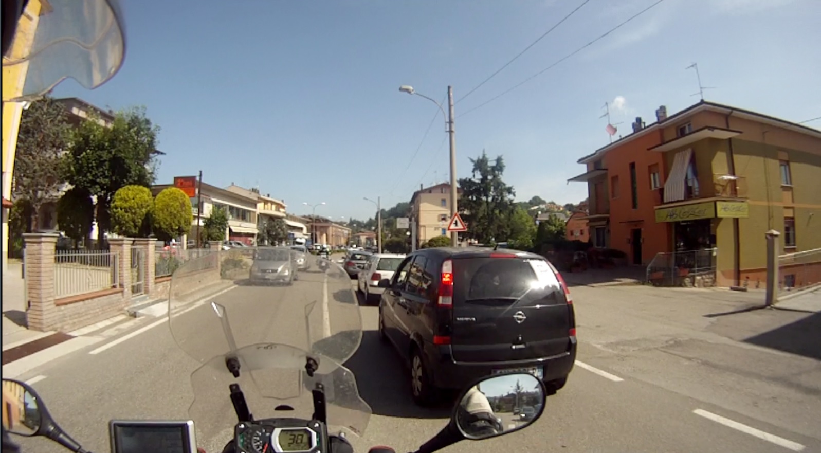 Und schon ging es wieder los. Italiener können einfach nicht hinter Motorrädern fahren. Sie müssen überholen, auch wenn es weder Sinn macht, noch ohne Risiko von Statten geht. Trotz Überholverbot und obwohl der kaum etwas nach vorne sah, musste so ein Schwachkopf sich vorbeizwängen. Weil seine Scheißkarre kaum PS hatte, reichte es natürlich nicht und er schnitt mich so brutal, dass ich bremsen und nach rechts ausweichen musste. Leider hatte ich meine Boden-Boden-Raketen vor den Urlaub ausgebaut, sonst hätte ich ihn damit pulverisiert. Mit Klaus ging er ähnlich um und blieb dann hinter dem nächsten PKW hängen. Seinen Zeitvorteil von 5 Sekunden hat er sich sehr riskant erarbeitetet. Und dieser Schwachkopf sollte nicht der einzige bleiben.