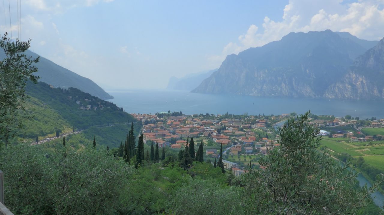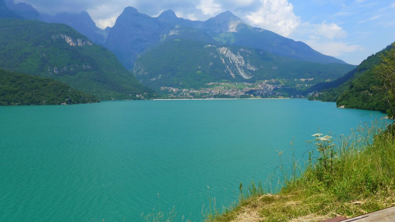 Bei Rovereto-Süd verließen wir die Autobahn, aber auch die Straße nach Riva war völlig verstopft. Roller- und italienische Motorradfahren fuhren an den Autos vorbei. Wir hängten uns hinten dran. Als wir wie alle anderen im Überholverbot an einer Polizeistreife vorbeifuhren, wurde mir etwas mulmig. Vor Riva bogen wir rechts ab und durchfuhren Arco. Ab Arco war die Welt wieder in Ordnung. Je höher wir in die Berge kamen, desto weniger heiß war es. Jeder Tunnel war willkommen, denn dort drin war es im Verhältnis zu draußen richtig frisch. Am Lago Di Molveno legten wir auf 800m eine Pause ein. Vom Lago aus waren es nur noch 40km zum Hotel.