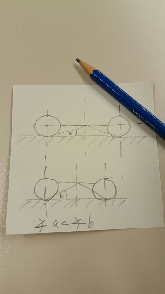 Jetzt wird es aber allmählich schon lustig. Der Böschungswinkel, den Du meinst, das ist der zwischen der Ebene und der Tangente an das Vorderrad zum vorderen Stoßfänger (oder was sonst niedriger ist) und der vom Hinterrad sinngemäß nach hinten, aber nicht ein Winkel zwischen den Achsen unter dem Fahrzeug.