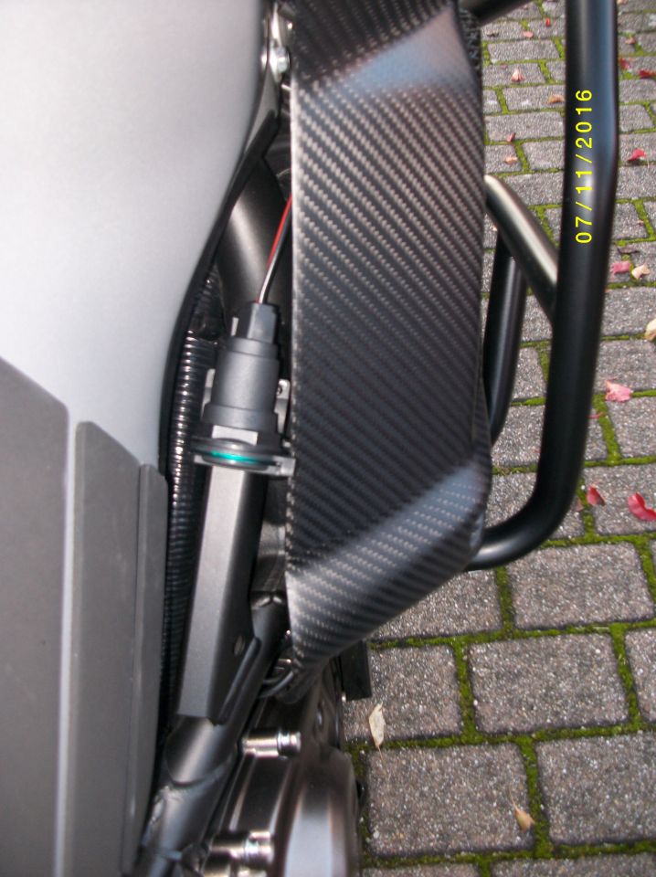 Habe mir die Batteriezustandsanzeige mit Ladebuchse von CETEK zugelegt und einen schönen Einbauort gefunden. Hinter der Kunststoffverkleidung sitz das ABS Steuergerät, aber es ist zufällig genau soviel Platz vorhanden wie der Stecker braucht.